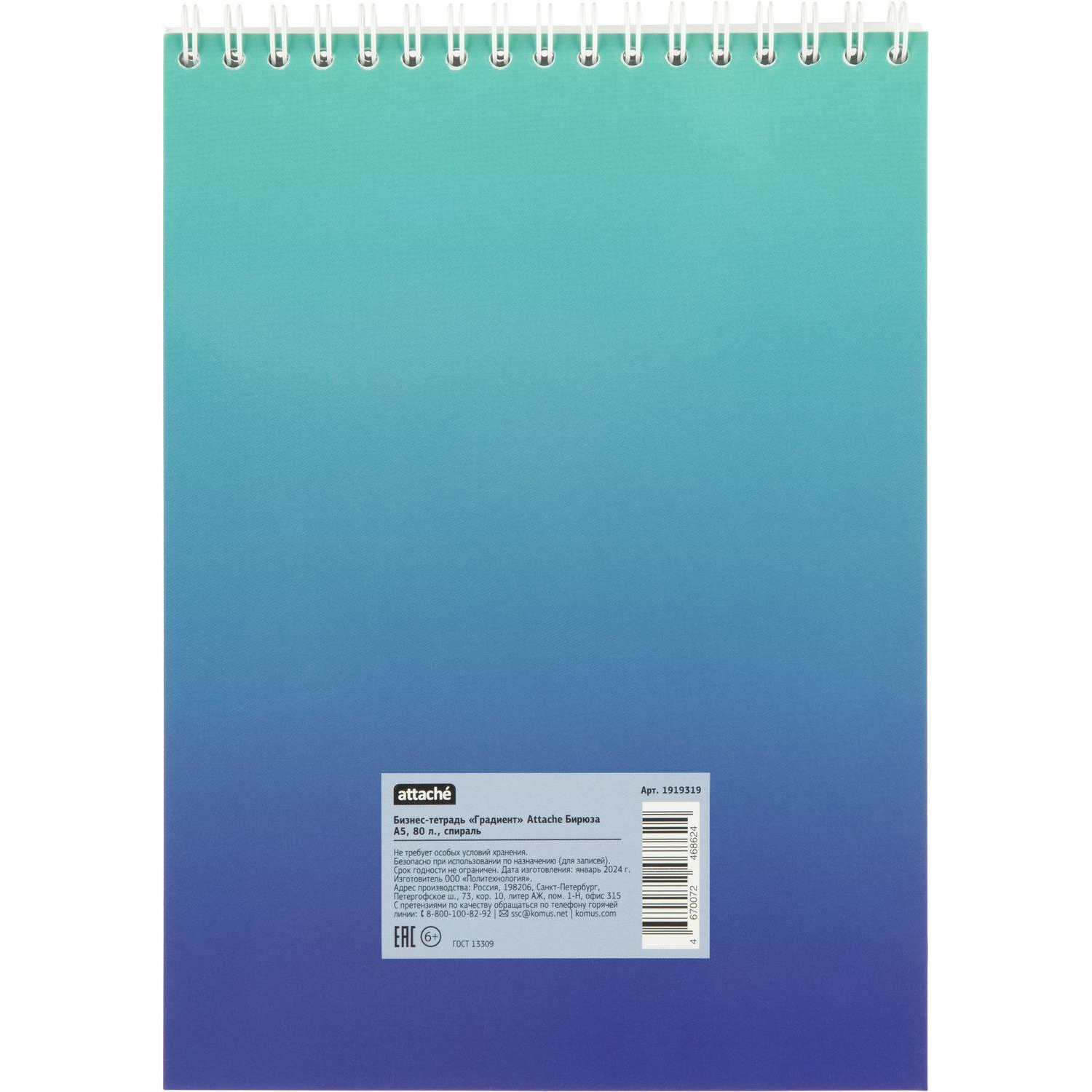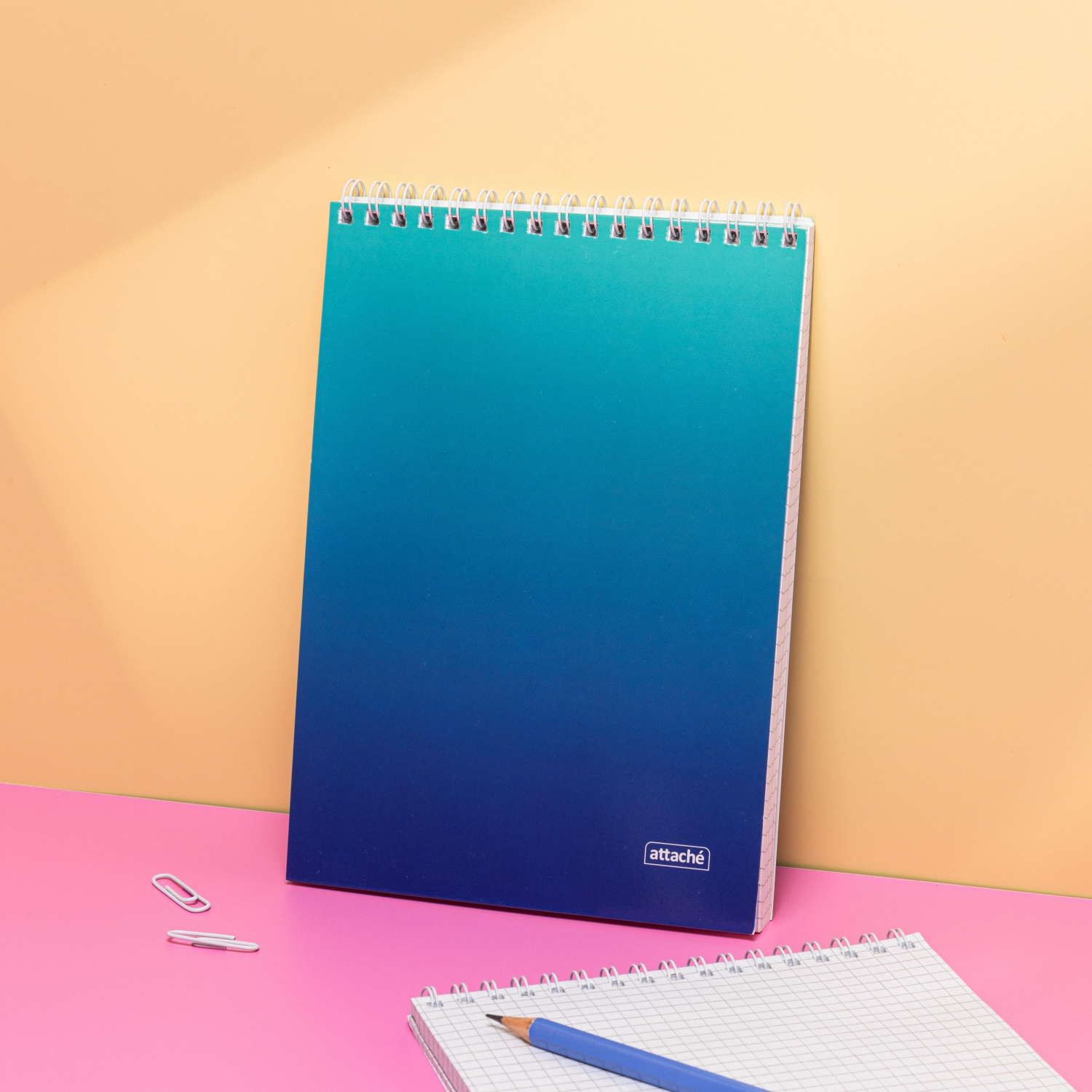 Бизнес-тетрадь Attache Градиент изготовлена форматом А5 (204х146 мм). Обложка и подложка изготовлены из мелованного картона 210 г/м2. Блок-офсетная бумага 60г/м2, разлинованная в клетку. Количество листов в блоке-80. Тетрадь скреплена металлическим гребнем (спиралью) по короткой стороне сверху. Применяется в школах, высших учебных заведениях и офисах. Законодательные и технические документы
