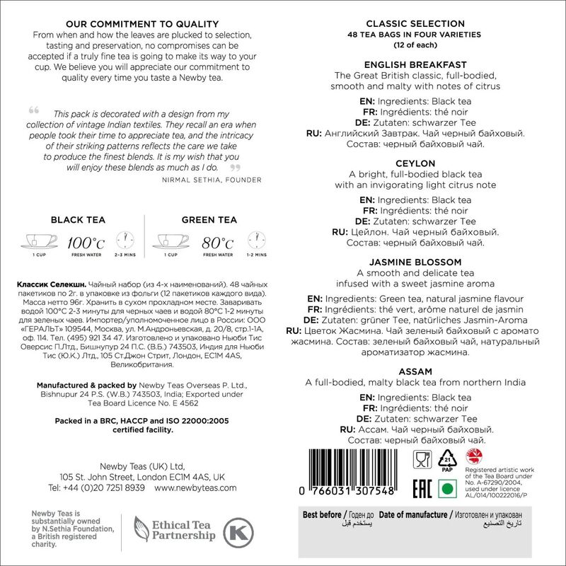 Чай ассорти Newby Finest Blend 48 пакетиков. Чай черный Classic Selection Newby — коллекция классических чаев. В упаковке любимые черные чаи: богатый Английский Завтрак, крепкий Ассам, пряный Цейлон и нежный зеленый чай Цветок Жасмина.
