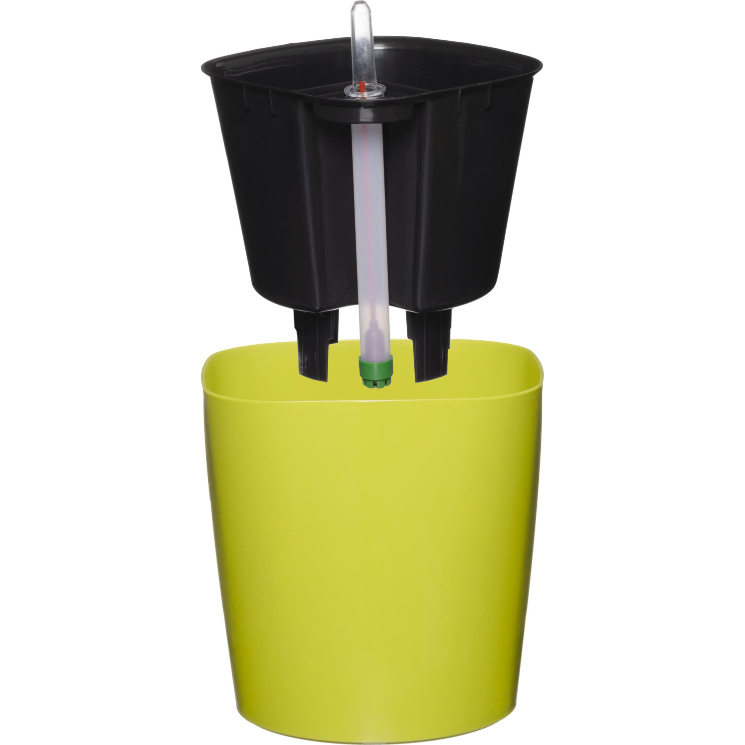 Горшок состоит из трех частей - внешнее кашпо, внутренняя часть и индикатор воды. Такая конструкция позволяет поливать растение 1 раз в 2-3 недели, что не приведет к переливу растения. Размер изделия: 17x16 см. Объем: 3 л.