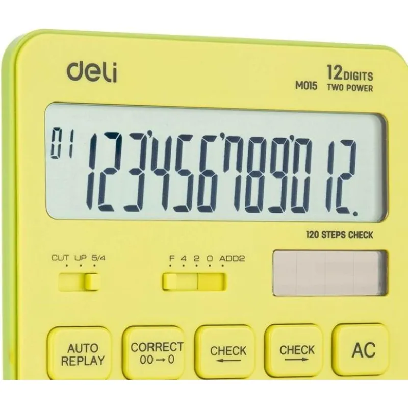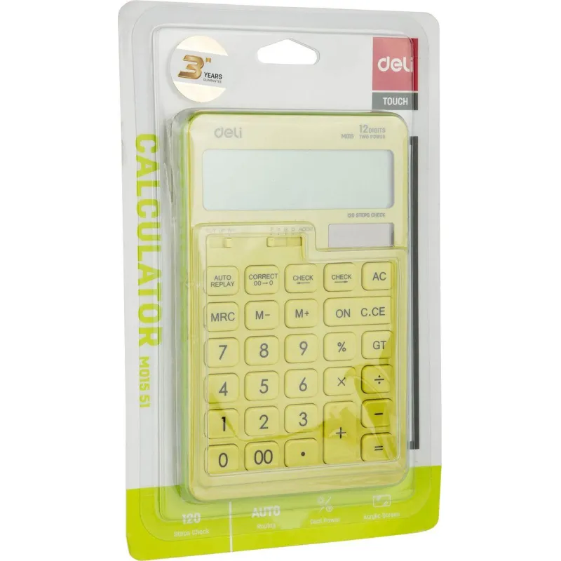 Калькулятор настольный компактный Deli Touch EM01551 в пластиковом желтом корпусе поможет выполнить базовые вычисления везде, где бы Вы не находились. Подойдет ученикам старших классов, бакалаврам, магистрам, студентам, научным работникам. Калькулятор производит все основные арифметические действия, вычисления с памятью, расчет процентов, и возведение в степень. Удобная клавиатура снабжена кнопкой ввода двойного нуля. Складная подставка для четкого и удобного просмотра. Широкоугольный экран для четкого просмотра. Двойное питание (солнечная батарея) и автоматическое отключение увеличивают срок службы. Питание калькулятора автоматически отключается после 5 — 12 минут бездействия. Разрядность дисплея: 12. Размер: 175х108х15 мм. Батарейка LR54 в комплекте. Наличие кнопки «Коррекция последнего введенного значения» — да.
