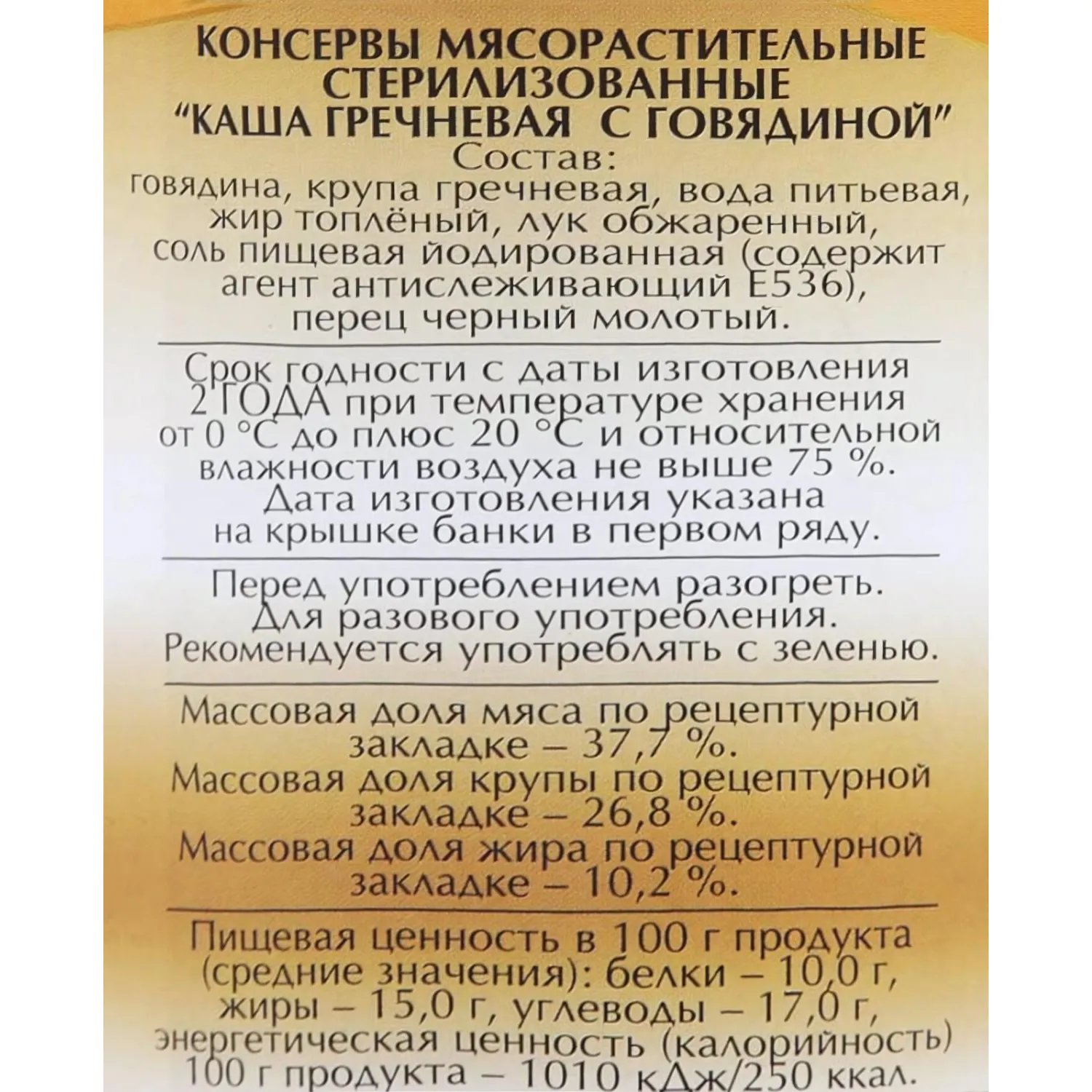 Состав: говядина, крупа гречневая, вода питьевая, жир топленый, лук обжаренный, соль пищевая йодированная (содержит агнет антислеживающий Е536) перец черный молотый.