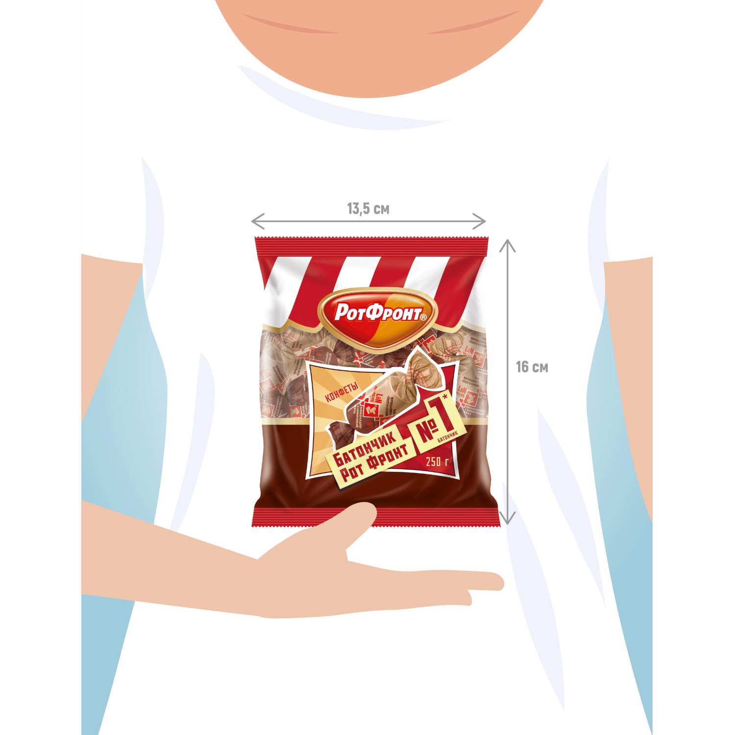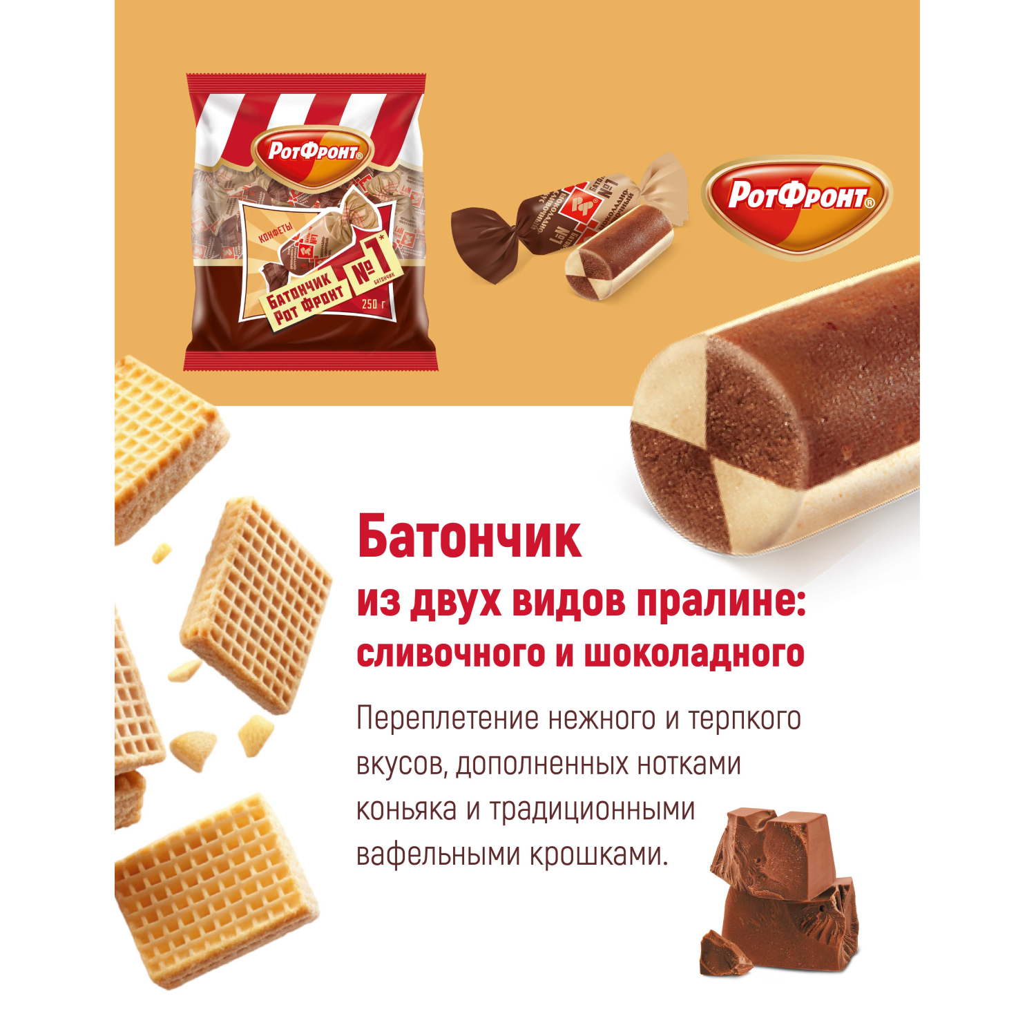 Конфеты Рот Фронт Батончики с шоколадно-сливочным вкусом 250 г. Состав: сахар, заменитель масла какао (растительные масла: частично гидрогенизированное пальмовое масло, частично гидрогенизированное рапсовое масло, антиокислители: лимонная кислота, токоферолы, концентрат смеси, лецитин подсолнечника), арахис тертый, вафли дробленые (вода питьевая, мука пшеничная хлебопекарная, масло подсолнечное рафинированное дезодорированное, меланж сухой яичный, эмульгатор лецитин соевый, соль, разрыхлитель-гидрокарбонат натрия, регулятор кислотности - лимонная кислота), мука соевая дезодорированная, сухое цельное молоко, какао-порошок, сухие сливки, коньяк, ароматизаторы: Молоко, Шоколад, антиокислитель - аскорбиновая кислота. Противопоказано при индивидуальной непереносимости белка молока и/или яичного белка. Пищевая ценность в 100 г продукта: белки - 11 г, жиры - 30 г, углеводы - 50 г, пищевые волокна - 3,3 г. Энергетическая ценность в 100 г продукта: 2170 кДж (520 ккал). Хранить при температуре от +15°С до +21°С и относительной влажности воздуха не более 75%. Страна производства: Россия.