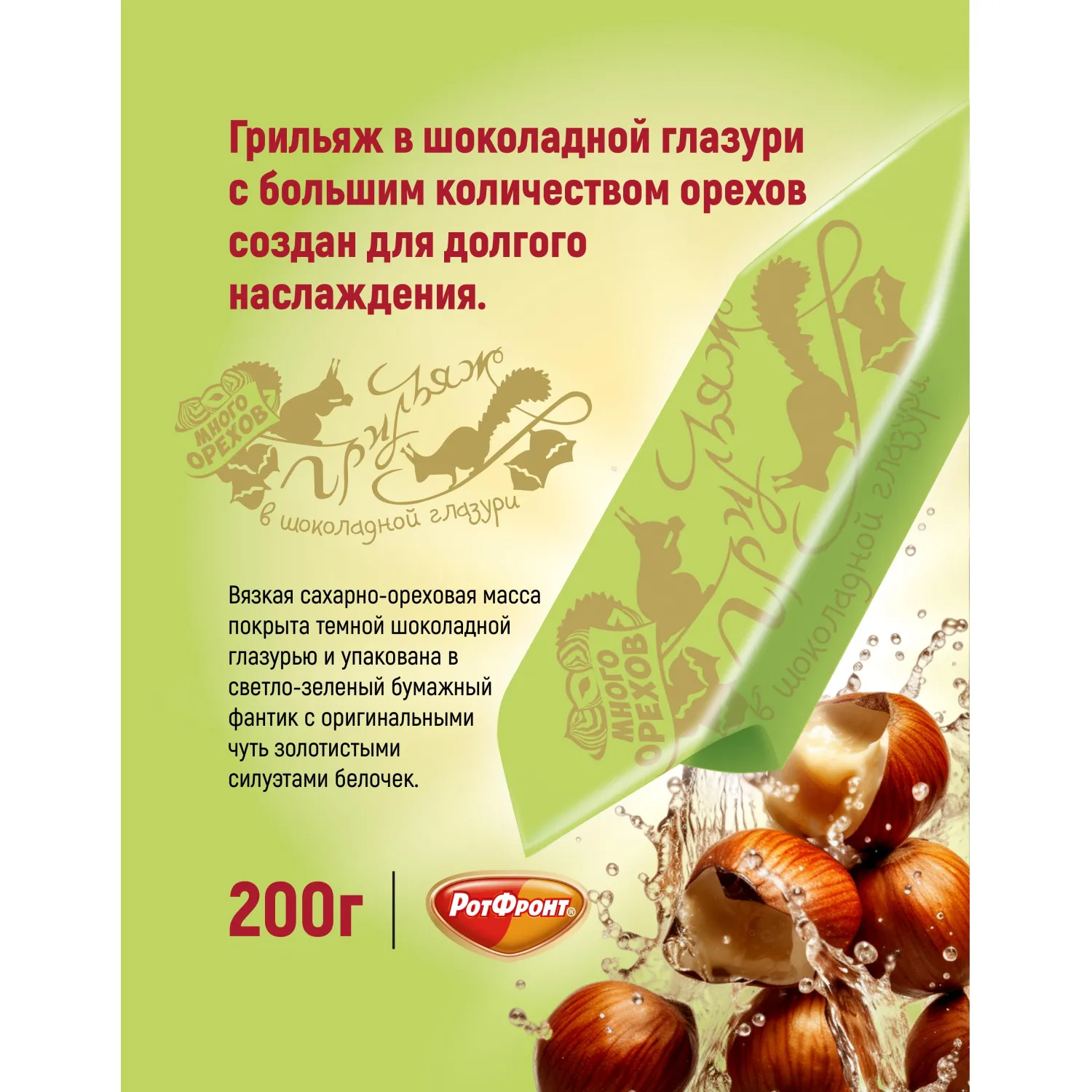 Конфеты Рот Фронт Грильяж в шоколаде 200 г - это великолепное лакомство для поклонников орехово-карамельных конфет. Грильяжная масса на основе фундука с ароматом ванили в шоколадной глазури Питательное лакомство подарит положительные эмоции и поможет восстановить энергию в моменты усталости и высокой умственной нагрузки. Порция сладкого повысит умственную активность и избавит от чувства голода. Встреча гостей, чаепития с друзьями или в кругу семьи в сопровождении шоколадных конфет с орехово-карамельной начинкой не оставят никого равнодушными. Упаковка &,#039,Грильяжных&,#039, конфет станет достойным компонентом для создания подарочной продуктовой корзины и приятным спутником уютных, душевных домашних чаепитий. Состав: арахис дробленый, шоколадная глазурь (сахар, какао тертое, эквивалент масла какао (растительные негидрогенизированные масла (пальмовое, ши, иллипе, подсолнечное)), какао-порошок, эмульгаторы: лецитин соевый Е476, ароматизатор &,#039,Ваниль&,#039,), сахар, патока, пюре яблочное (яблоки, консервант - диоксид серы), заменитель молочного жира (рафинированные, дезодорированные растительные масла: пальмовое и его фракции, подсолнечное, пальмоядровое, антиокислители Е319, Е330), ароматизатор &,#039,Грильяж&,#039,, желирующий агент каррагинан (экстракт морских водорослей), регуляторы кислотности: Е33 и кислота лимонная, эмульгатор лецитин соевый. Не подвергать воздействию прямого солнечного света. Вес: 200 грамм Тип упаковки: флоу-пак Страна производства: Россия Срок хранения: 9 месяцев