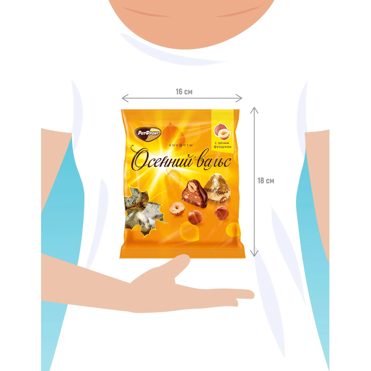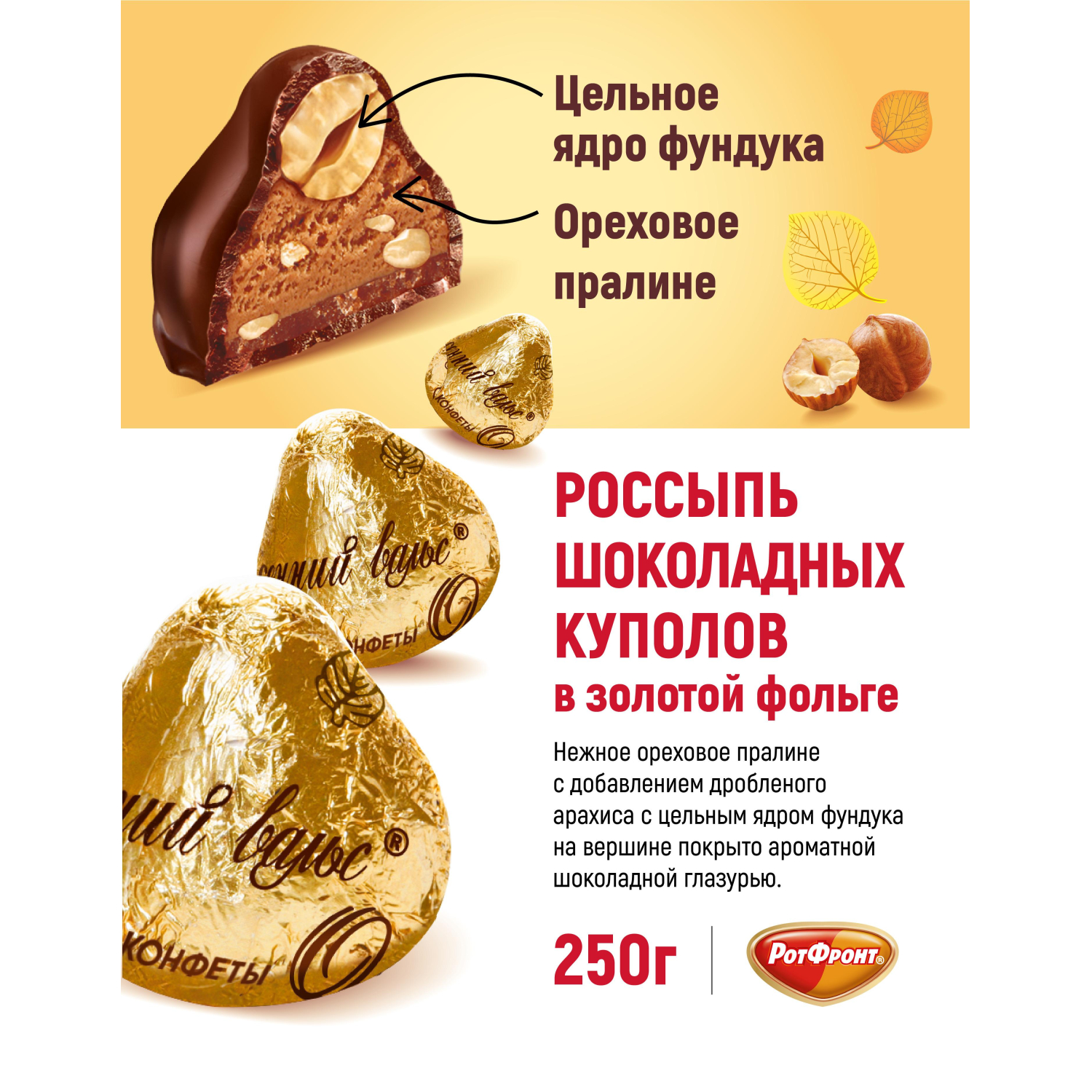 Глазированные шоколадной глазурью куполообразные конфеты из пралине с добавлением жареного дробленого арахиса, на вершине конфеты - целое ядро фундука. Состав: шоколадная глазурь (сахар, какао тертое, эквивалент масла какао (растительные негидрогенизированны?е масла (пальмовое, ши, иллипе, подсолнечное)), какао - порошок, эмульгаторы: соевый лецитин, Е476, ароматизатор &,#039,Ванильный&,#039,), сахар, сухое цельное молоко, арахис тертый, заменитель масла какао (частично гидрогенизированная фракция пальмового масла, эмульгаторы: Е492, лецитин соевый: антиокислители: токоферолы, концентрат смеси лимонная кислота), ядро ореха фундука целое, арахис дробленый, какао-порошок, эмульгаторы: лецитин соевый, антиокислитель - аскорбиновая кислота, ароматизатор &,#039,Ванильный&,#039,. Пищевая ценность в 100 г продукта: белки - 11 г, жиры - 34 г, углеводы - 49 г, пищевые волокна - 3,8 г. Энергетическая ценность в 100 г продукта: 550 ккал. Хранить при температуре от +15°С до +21°С и относительной влажности воздуха не более 75 %.