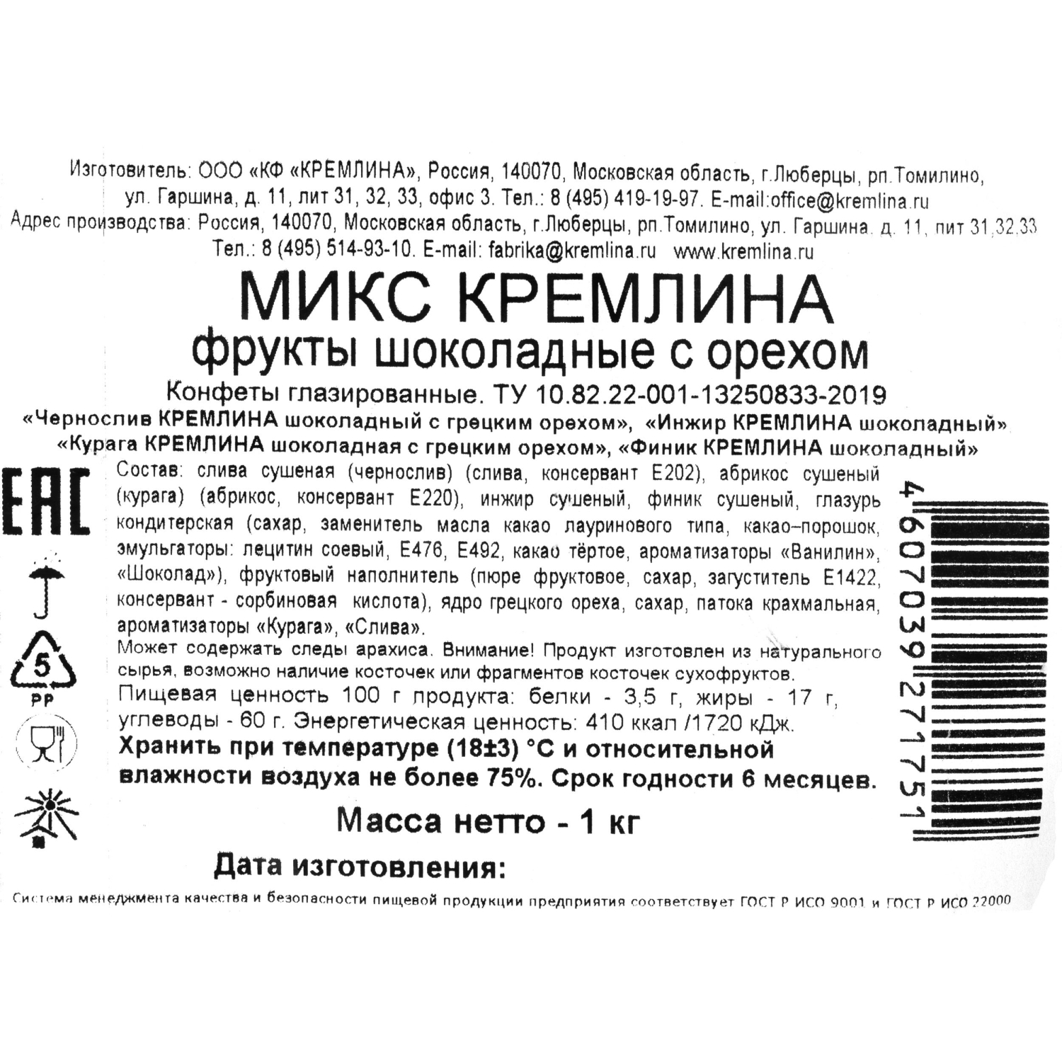 Набор из сухофруктов в шоколадной глазури.Аппетитные Чернослив, Курага, Финик и Инжир с орехами высочайшего качества из самых теплых стран мира. Богатый ассортимент в одной упаковке. Конфеты в шоколадной глазури: чернослив с грецким орехом, курага с грецким орехом, финик, инжир. Состав: слива сушеная (чернослив), абрикос сушеный (курага), глазурь кондитерская (сахар-песок, заменитель масла какао, какао порошок, эмульгатор - лецитин соевый, ароматизатор, идентичный натуральному Ванилин), фруктовый наполнитель (пюре сливовое, плодово-ягодное пюре, пюре абрикосовое, сахар, загуститель Е 1422, консервант - сорбиновая кислота), сахар, патока крахмальная. Пищевая ценность в 100 г продукта: Белки - 2,7 г, жиры - 16 г, углеводы 58 г. Энергетическая ценность в 100 г продукта: 381 ккал. Хранить при температуре от +15°C до +21°C в сухом прохладном месте, не допускать замерзания.