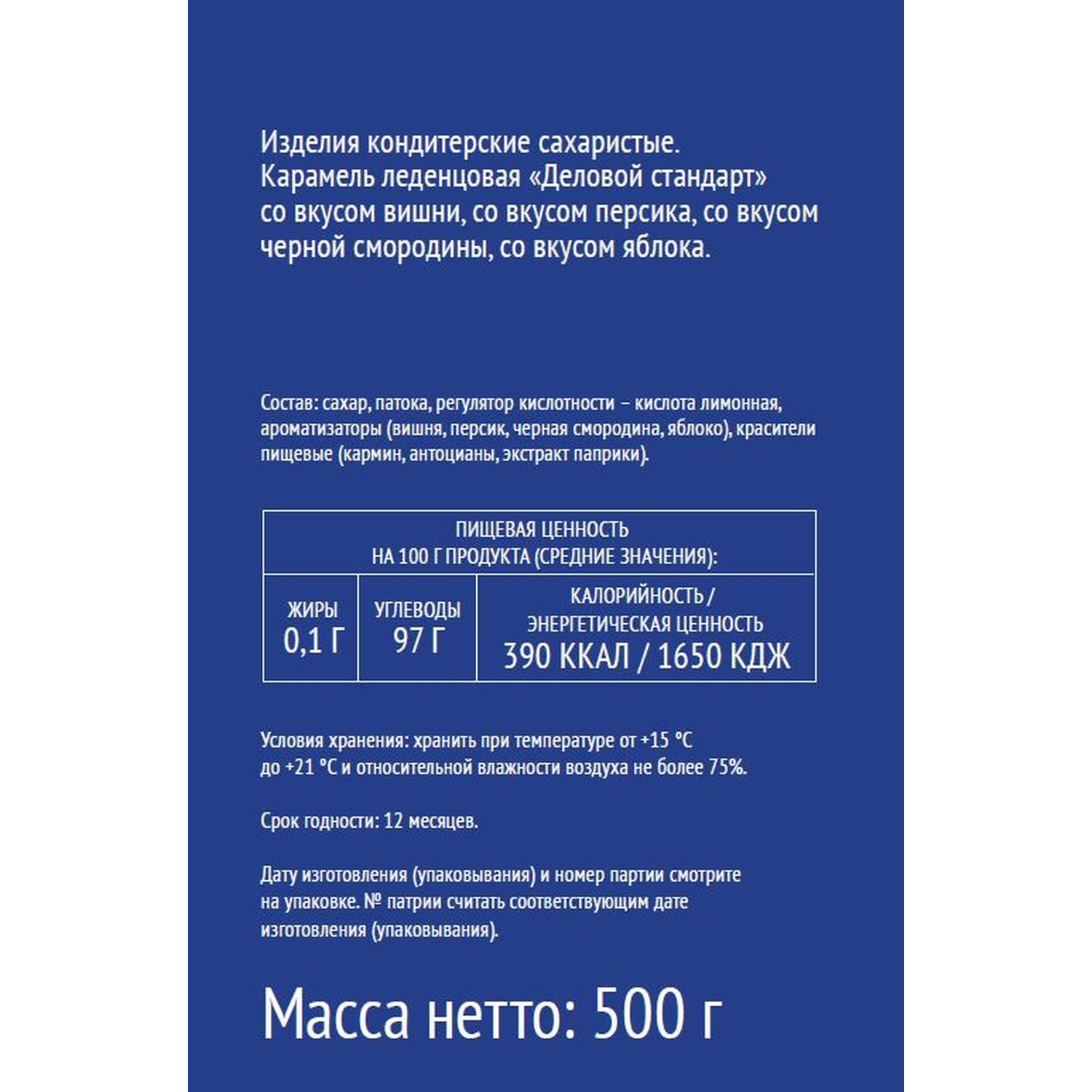 Леденцовая карамель &,#039,Деловой стандарт&,#039, - это вкусное и натуральное лакомство, наслаждаться которым можно практически бесконечно. В нашей карамели, приготовленной по традиционным рецептам, есть вкусы сочной вишни, зелёного яблоко, ароматного персика и черной смородины. Состав: сахар, сироп мальтозный, пищевые добавки: регулятор кислотности - кислота лимонная, ароматизаторы (вишня, персик, черная смородина, яблоко), красители пищевые (кармин Е120, антоцианы Е163, экстракт паприки Е160с). Пищевая ценность в 100 г продукта: жиров - 0.1 г, углеводов - 97 г. Энергетическая ценность: 380 ккал/1591 кДж. Тип упаковки: картонная. Вес: 500 г. Хранить при температуре 18+3 °C и относительной влажности воздуха не более 75%. Срок годности: 12 месяцев. Страна производства: Россия. Изготовитель: ООО &,#039,Малвикъ&,#039,.