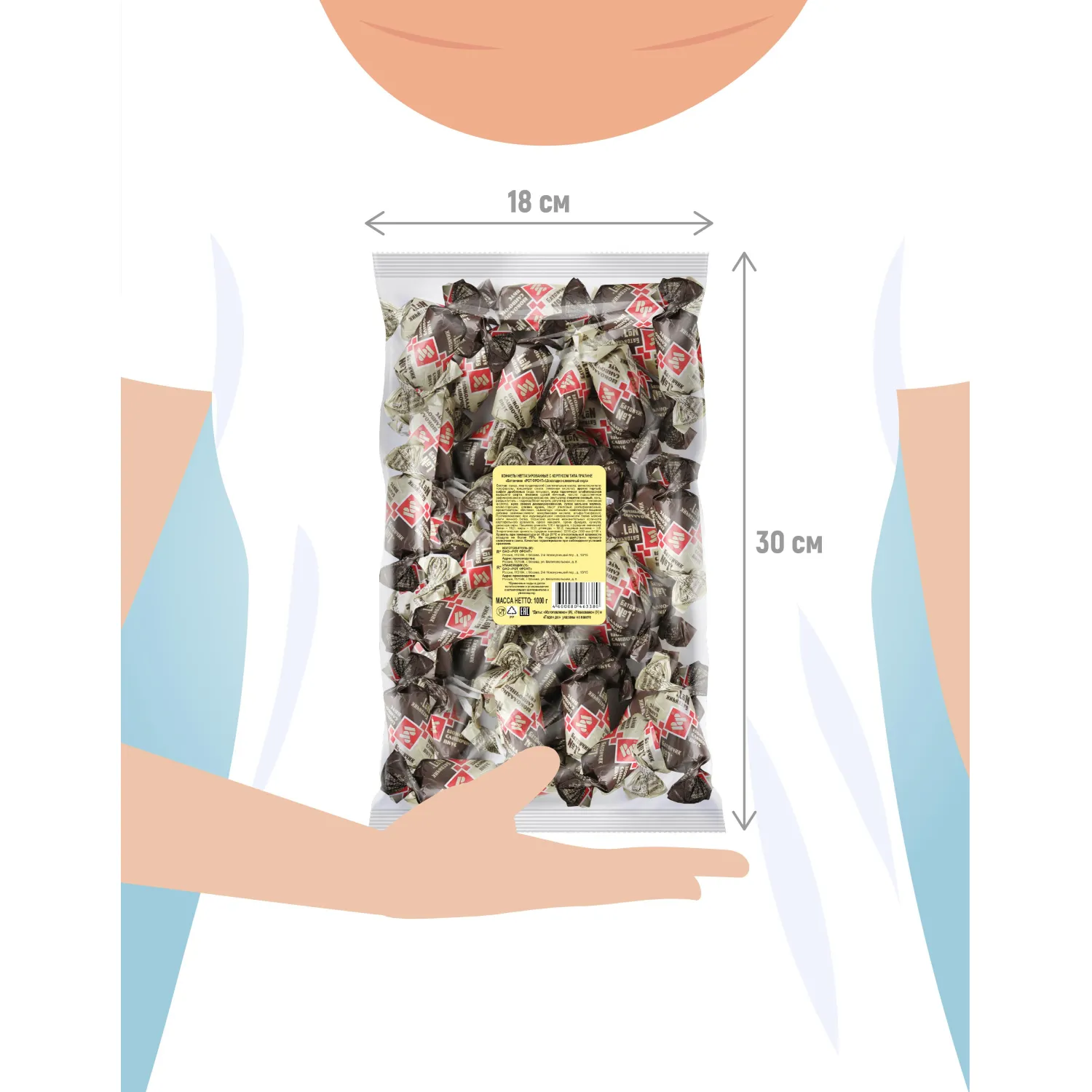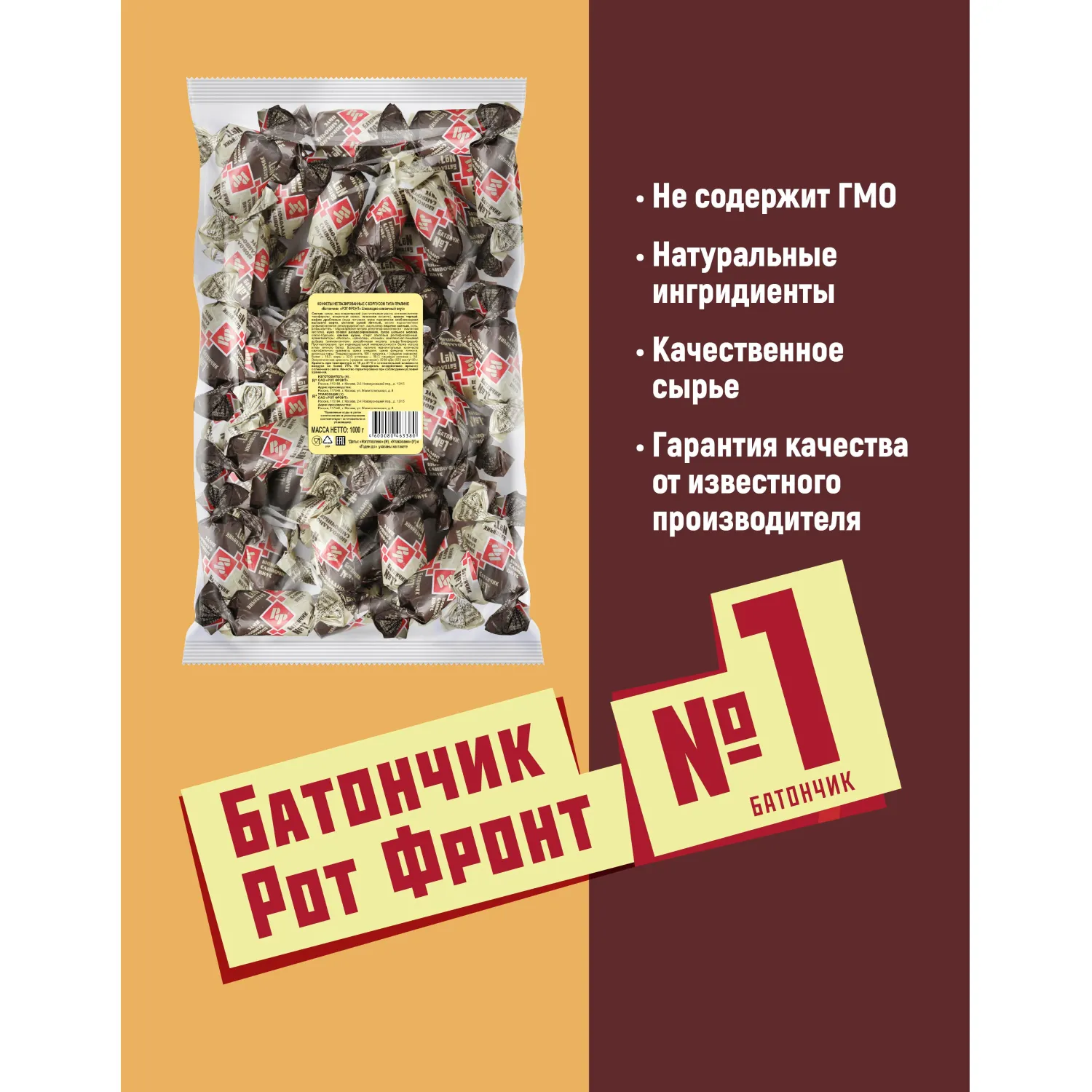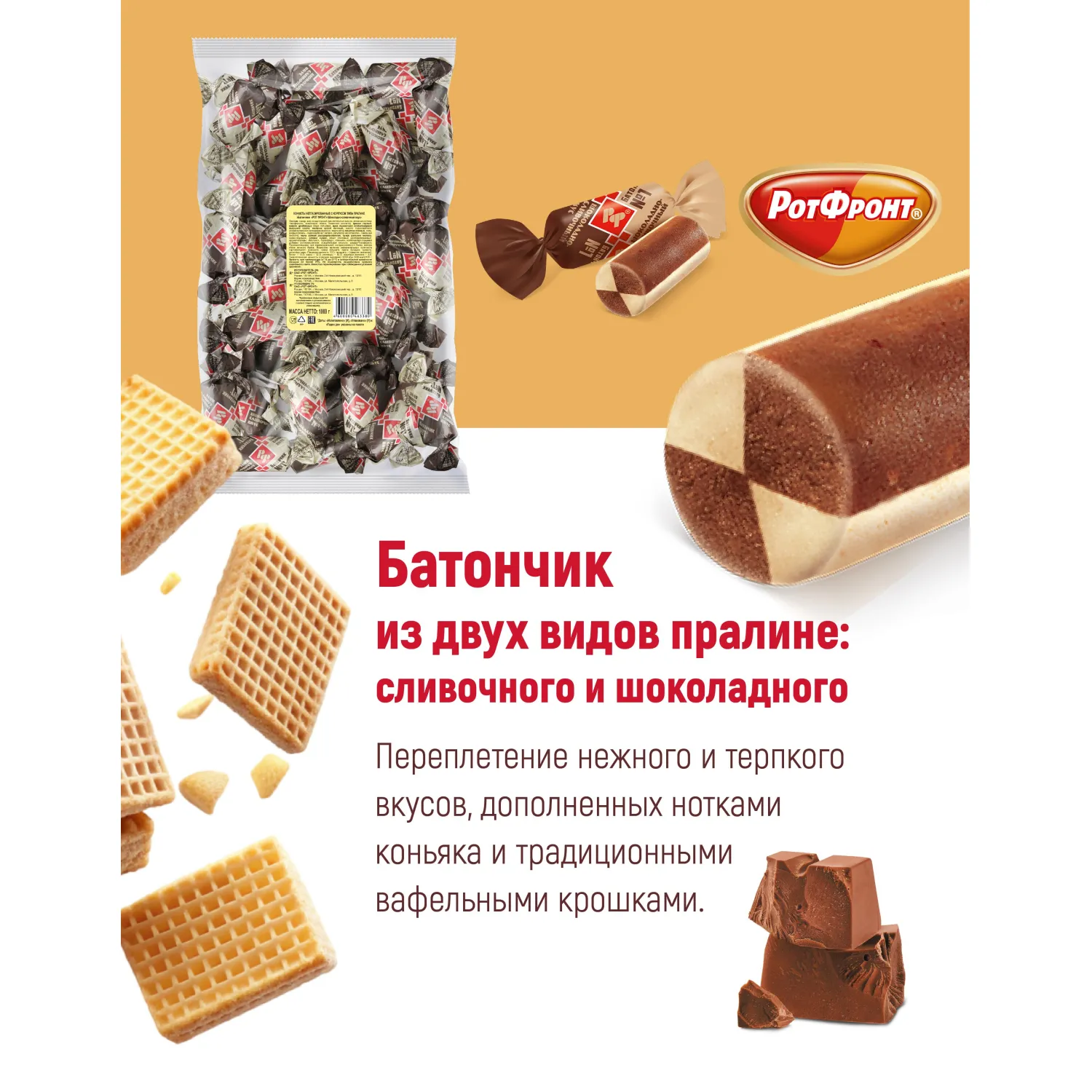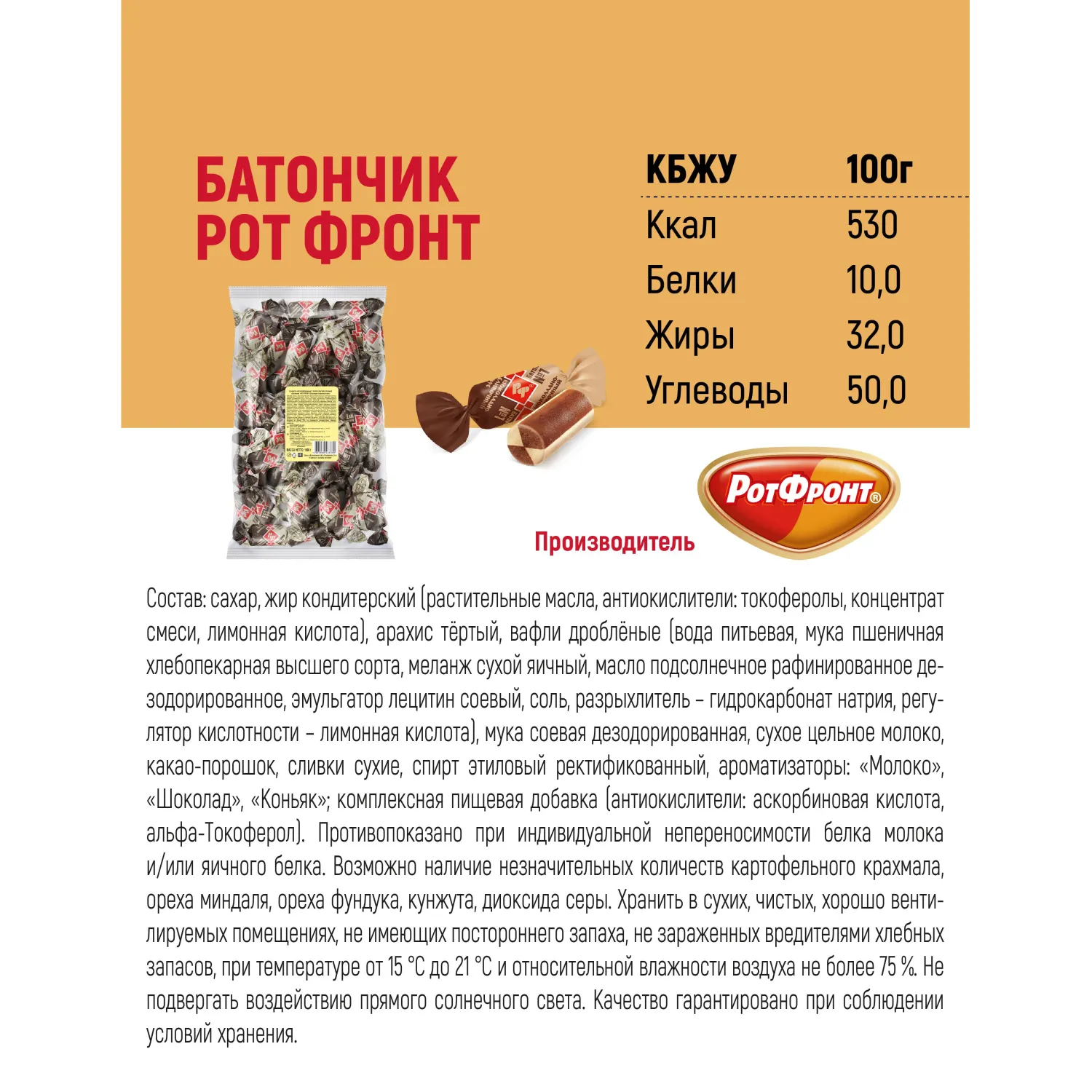 Классические неглазированные конфеты "Батончики" от фабрики "Рот Фронт". Плотная орехово-сливочная масса с добавлением какао и крошек хрустящих вафель. Отлично сочетаются с чаем, тают во рту, оставляя нежное сладкое послевкусие. Никакой глазури, только нежный вкус традиционного арахисового батончика! Состав: сахар, арахис тертый, заменитель масла какао (растительные масла: частично гидрогенизированное пальмовое масло, частично гидрогенизированное рапсовое масло, антиокислители: лимонная кислота, токоферолы, концентрат смеси, лецитин подсолнечника), вафли дробленые (вода питьевая, мука пшеничная хлебопекарная высшего сорта, масло подсолнечное рафинированное дезодорированное, меланж сухой яичный, эмульгатор лецитин соевый, соль, разрыхлитель - гидрокарбонат натрия, регулятор кислотности - лимонная кислота), мука соевая дезодорированная, сухое цельное молоко, какао-порошок, антиокислитель аскорбиновая кислота, ароматизатор "Ванильный". Противопоказано при непереносимости белка молока и/или яичного белка. Пищевая ценность на 100 г продукта, г: белки - 11,0, жиры - 29,0, углеводы - 53,0. Энергетическая ценность: 520 ккал. Срок годности: 9 месяцев. Хранить при температуре от 15 до 21°С и относительной влажности воздуха не более 75%. Не подвергать воздействию прямого солнечного света. Масса нетто: 1 кг. Страна производства: Россия.