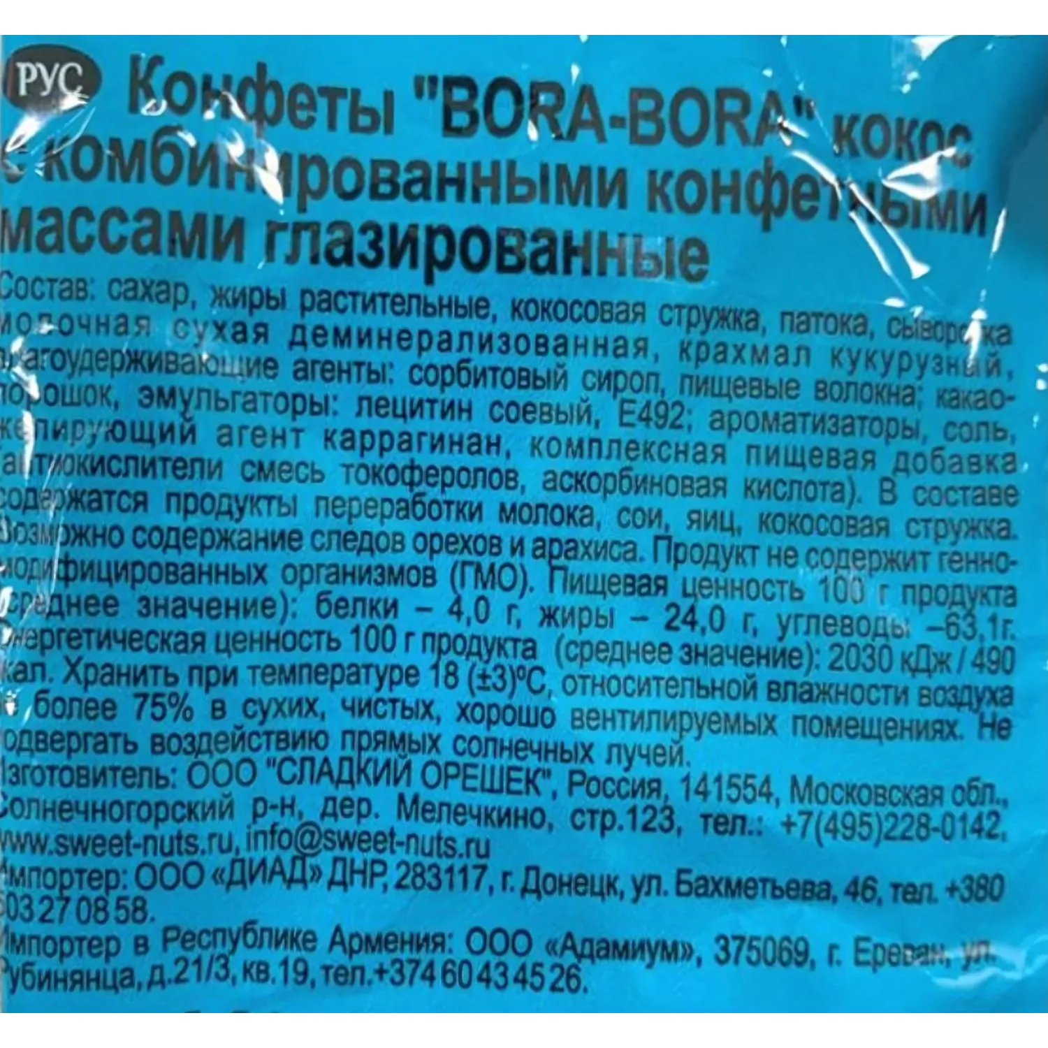 Конфеты Bora-Bora - сочетание нежного сливочного крема, премиальной кокосовой мякоти и молочно-шоколадной глазури- идеальный вкусовой тандем, ставший классикой. Вес - 200 г. Состав: сахар, жиры растительные, кокосовая стружка, патока, сыворотка молочная сухая деминерализованная, крахмал кукурузный, влагоудерживающие агенты: сорбитовый сироп, пищевые волокна, какао-порошок, эмульгаторы: лецитин соевый, Е492, ароматизаторы, соль, желирующий агент каррагинан, комплексная пищевая добавка (антиокислители смесь токоферолов, аскорбиновая кислота). В составе содержатся продукты переработки молока, сои, яиц, кокосовая стружка. Возможно содержание следов орехов и арахиса. Продукт не содержит ГМО. Пищевая ценность 100 г продукта (среднее значение): белки - 4,0 г, жиры - 24,0 г, углеводы - 63,1г. тиокислители смесь токоферолов, аскорбиновая кислота). Энергетическая ценность 100 г продукта (среднее значение): 2030 кДж / 490 ккал. Срок годности: 8 месяцев. Условия хранения: хранить при температуре 18(+3)°C и относительной влажности воздуха не более 75%. Производитель: ООО 'Сладкий Орешек'. Страна производства: Россия.