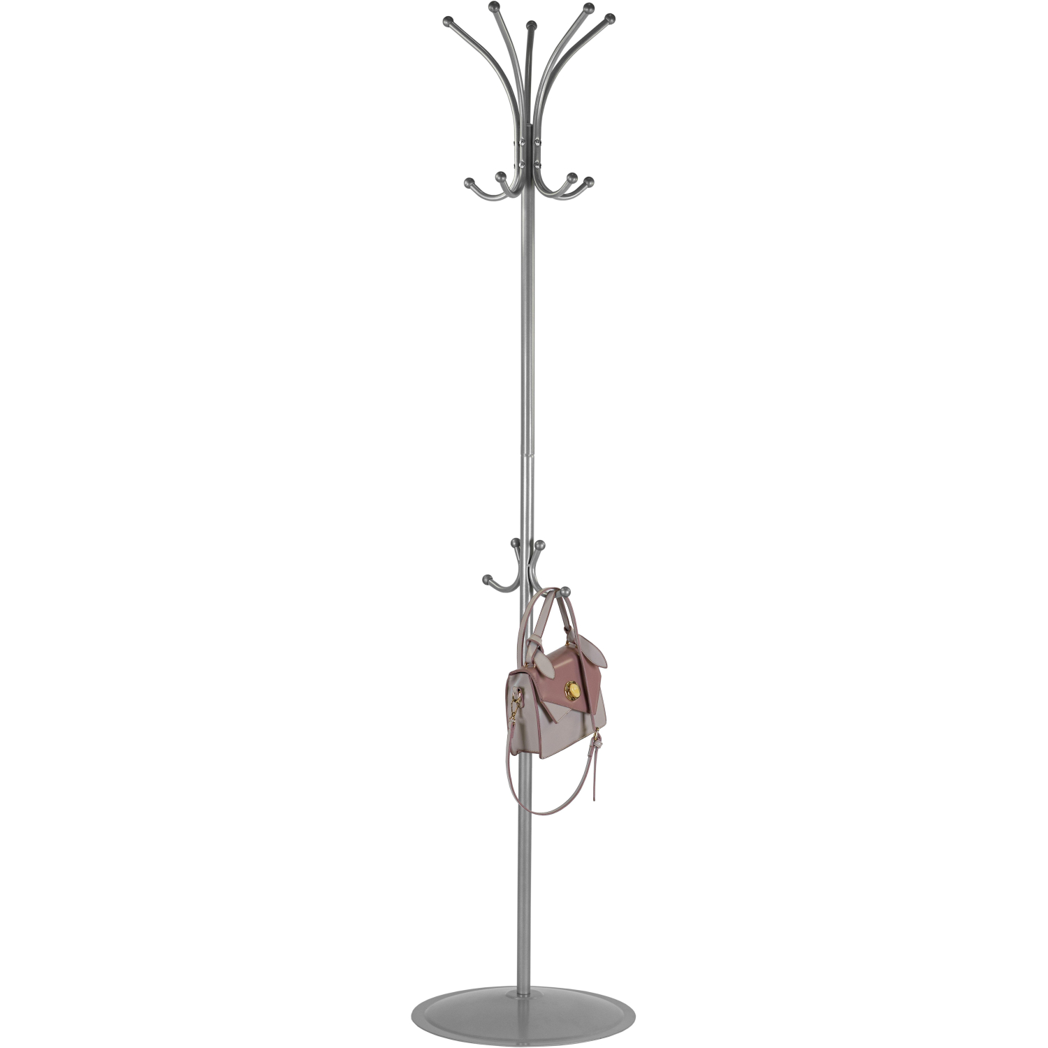 Изящная классическая металлическая вешалка для посетитиелейПико-4 изготовлена из стальной трубы диаметром 25 мм с полимерным покрытием. Оснащена 5 крючками для одежды, 5 крючками для головных уборов и 2 крючками для сумок, что делает ее удобной для использования в офисах, кафе, салонах. Пластиковые шарики идеально подходят под размер петель верхней одежды. Металлическое основание диаметром 41 см и весом 2 кг обеспечивает вешалке устойчивость.Изображения товаров на сайте не могут гарантировать точную цветопередачу.