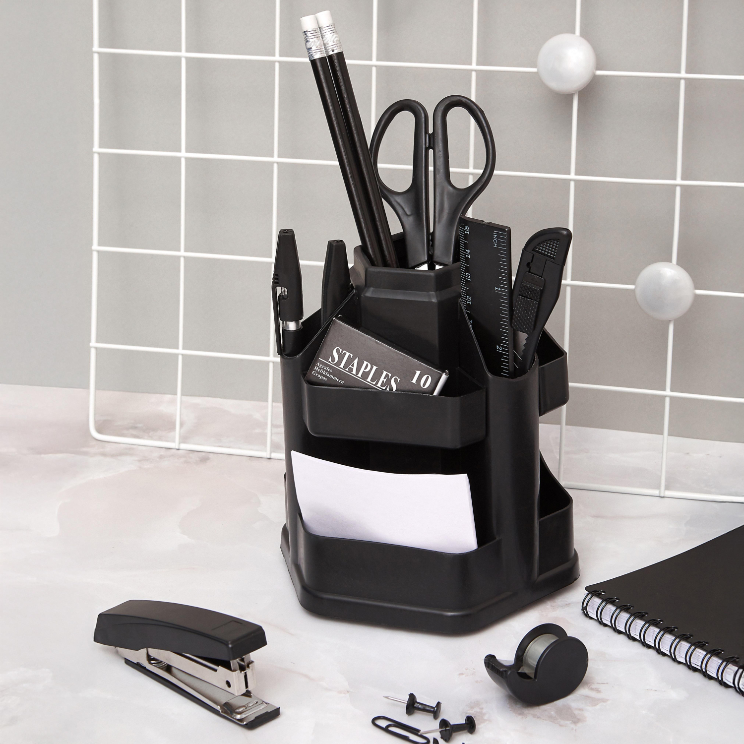 Настольный канцелярский набор Attache JC805 выполнен из пластика в черном цвете. Имеет вращающуюся на 360 градусов основу. В состав настольного набора входит: подставка, два карандаша с ластиком, два шариковые ручки, канцелярский нож, точилка, ластик, ножницы, блок для записи, линейка, клейкая канцелярская лента, силовые кнопки, степлер № 10, скобы для степлера № 10, антистеплер, скрепки. Размер изделия без наполнения (ДxШxВ) - 137x137x145 мм. Размер изделия с наполнением (ДxШxВ) - 137x137x200 мм. Относится к сегменту &,#039,суперэконом&,#039, - товар с минимальными требованиями к качеству для тех, кто хочет сэкономить. Товар отвечает основным характеристикам.