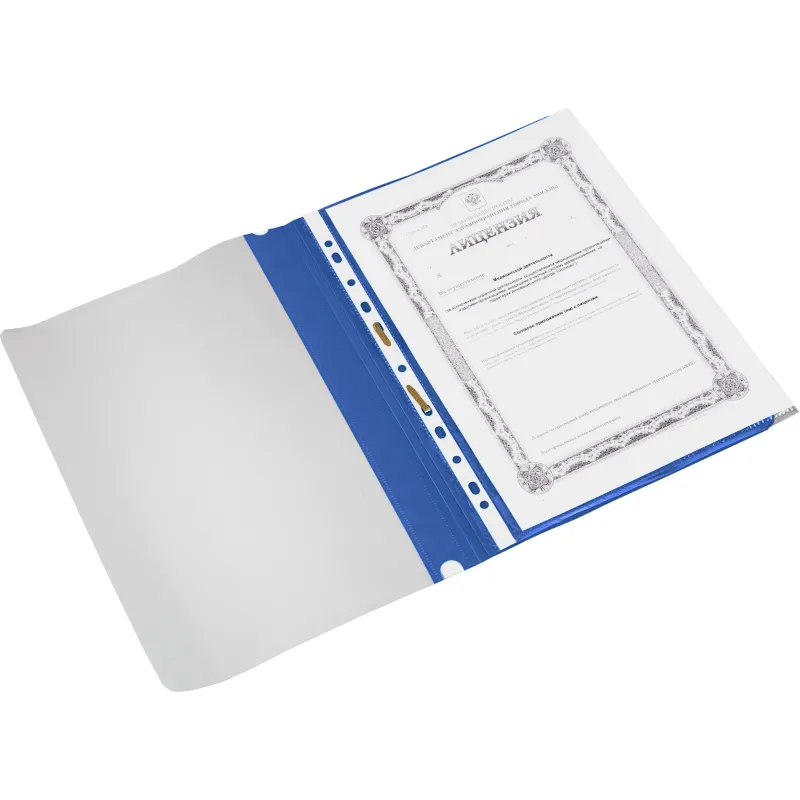 Скоросшиватель используется для хранения различного рода документации, для ведения документооборота, систематизации договоров, других важных бумаг. Папка изготовлена из мягкого пластика. Фактура - ",апельсиновая корка",. Толщина верхнего прозрачного листа - 130 мкм, нижнего цветного листа - 150 мкм. С прозрачной верхней обложкой. На лицевой стороне находится карман с белым бумажной полосой для указания содержания, вместимость - 100 листов стандартной плотности. Цвет - синий