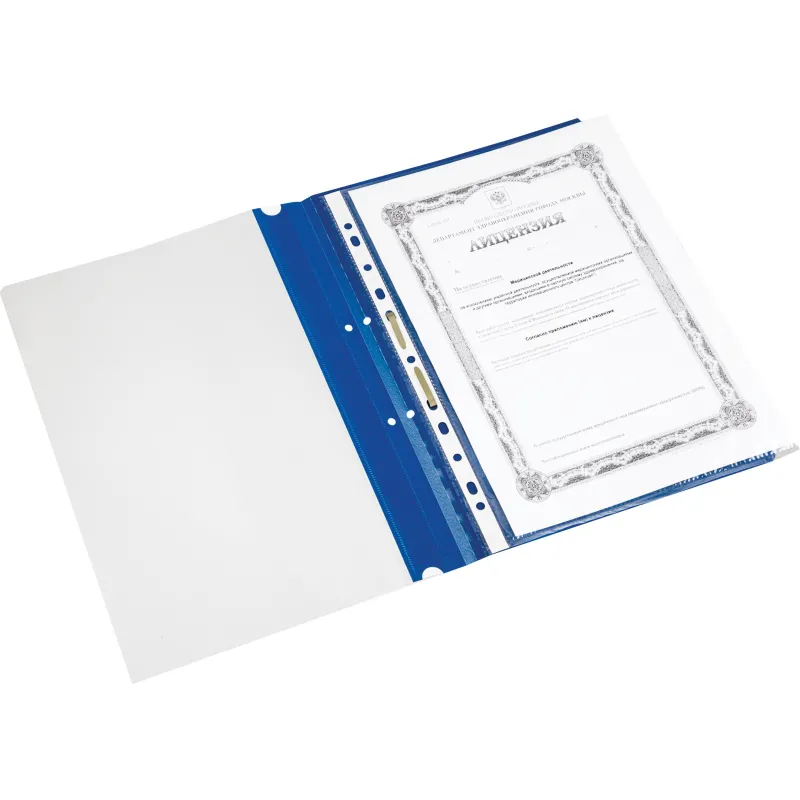 Скоросшиватель используется для хранения различного рода документации, для ведения документооборота, систематизации договоров, других важных бумаг. Дополнительные отверстия на корешке позволяют подшить скоросшиватель к папке. Скоросшиватель изготовлен из гладкого пластика . Толщина верхнего прозрачного листа - 110 мкм, нижнего цветного листа - 150 мкм. С прозрачной верхней обложкой. На лицевой стороне находится карман с белым бумажной полосой для указания содержания, вместимость - 100 листов стандартной плотности. Цвет- синий