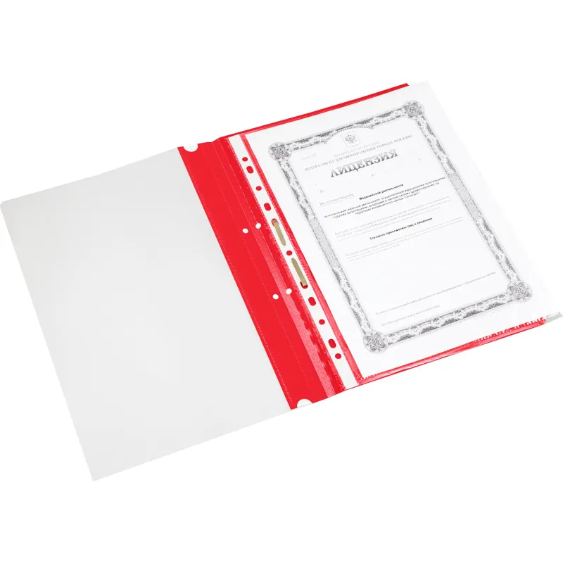 Скоросшиватель используется для хранения различного рода документации, для ведения документооборота, систематизации договоров, других важных бумаг. Дополнительные отверстия на корешке позволяют подшить скоросшиватель к папке. Скоросшиватель изготовлен из гладкого пластика . Толщина верхнего прозрачного листа - 110 мкм, нижнего цветного листа - 150 мкм. С прозрачной верхней обложкой. На лицевой стороне находится карман с белым бумажной полосой для указания содержания, вместимость - 100 листов стандартной плотности. Цвет- красный