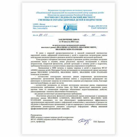 Компактный ранец BRAUBERG KIDS STANDARD выполнен из легкого формоустойчивого материала EVA, благодаря которому содержимое ранца надежно защищено от деформации. Компактный размер, эргономичность, вместительность – главные преимущества данной модели. Ранцы BRAUBERG KIDS STANDARD протестированы НИИ гигиены и охраны здоровья детей и подростков ФГАУ "Национальный медицинский исследовательский центр здоровья детей". В рамках проведенных исследований* было установлено, что конструкции и материалы ученических ранцев соответствуют современным эргономическим требованиям и способствуют формированию здоровой осанки у школьников.
