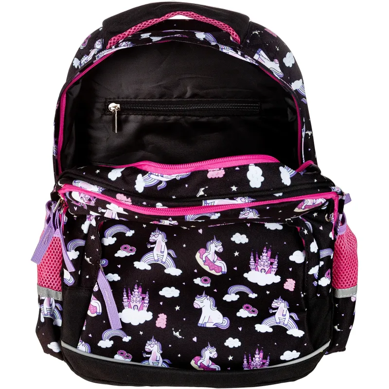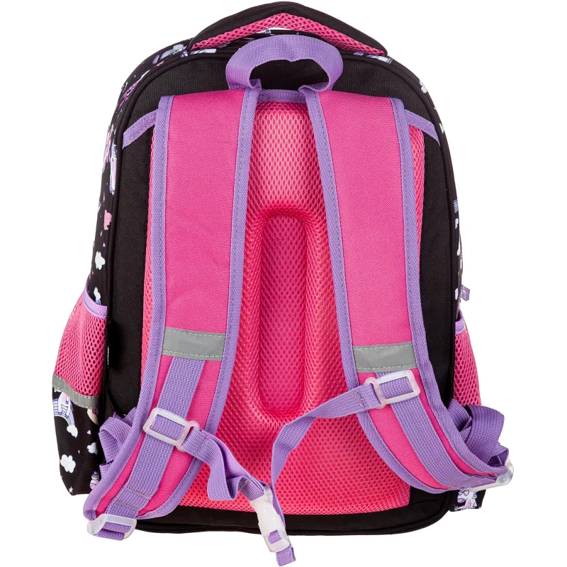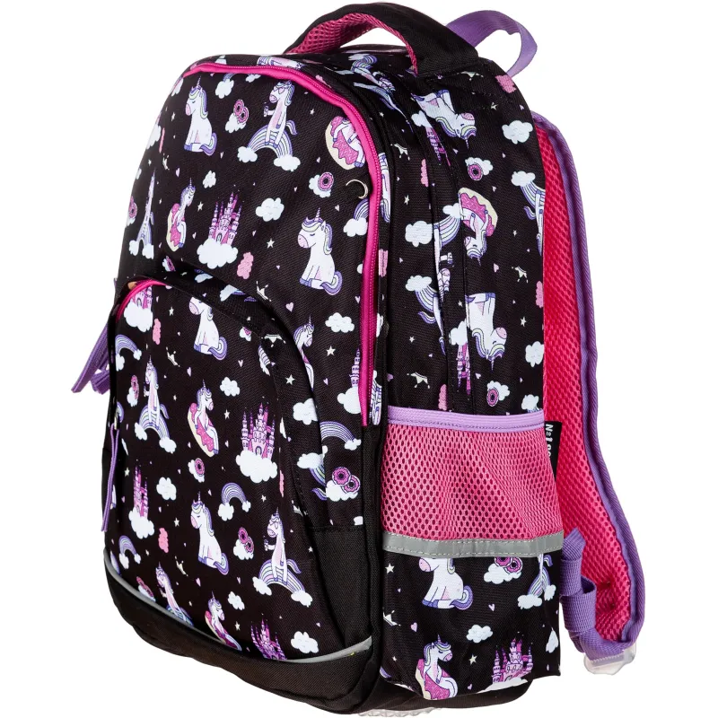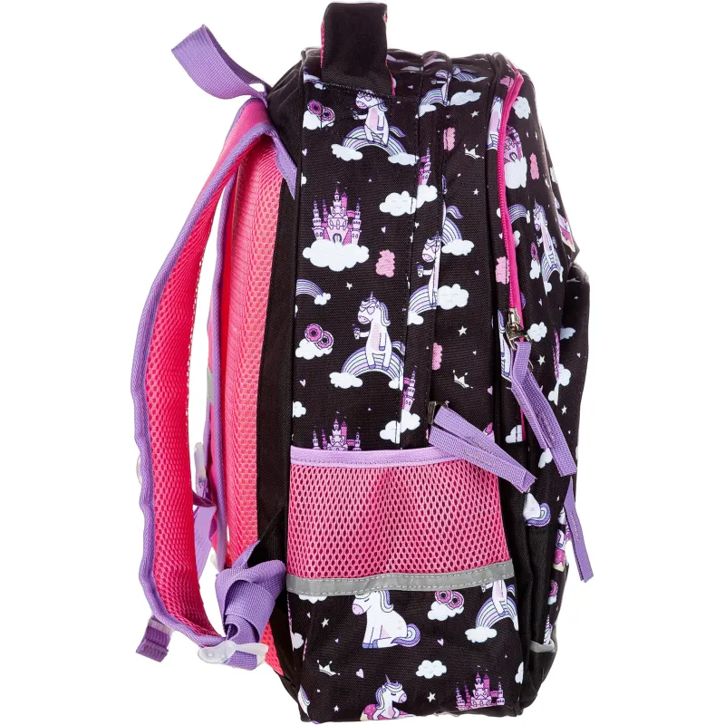 Рюкзак для девочек №1 School Uniland имеет два основных отделения и большой фронтальный карман на молнии с нанесенным орнаментом, а также два боковых сетчатых кармана. Одно отделение содержит органайзер с молнией, дополнено карманом на молнии для карточки. Основной материал полиэстер. Рюкзак снабжен светоотражающими элементами и ортопедической спинкой. Размеры (ДхШхВ) - 330х140х400 мм. Вес - 750 г.