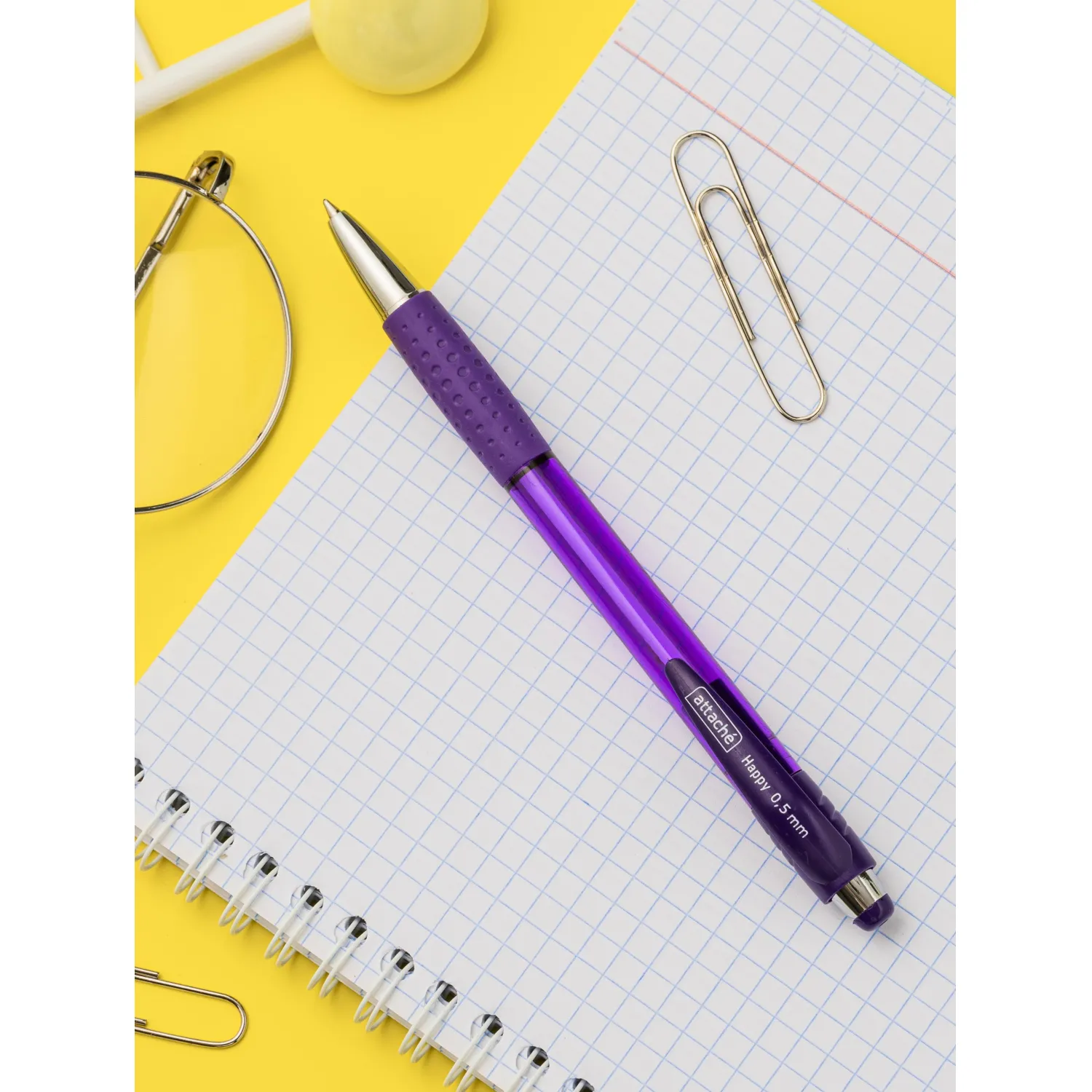 Автоматическая шариковая ручка Attache Happy в традиционном пластиковом корпусе с яркой резиновой манжеткой. Модель имеет автоматический механизм, пластиковый круглый корпус фиолетового цвета с резиновой манжеткой. Размер ручки: 138х10 мм. Стержень снабжен стандартным наконечником и заправлен масляными чернилами синего цвета. Диаметр пишущего узла 0,7 мм создает тонкую линию письма, равную 0,5 мм. Существует возможность замены стержня длиной 108 мм. Автоматическая шариковая ручка Attache Happy - это уникальное сочетание стиля, надежности и удобства!