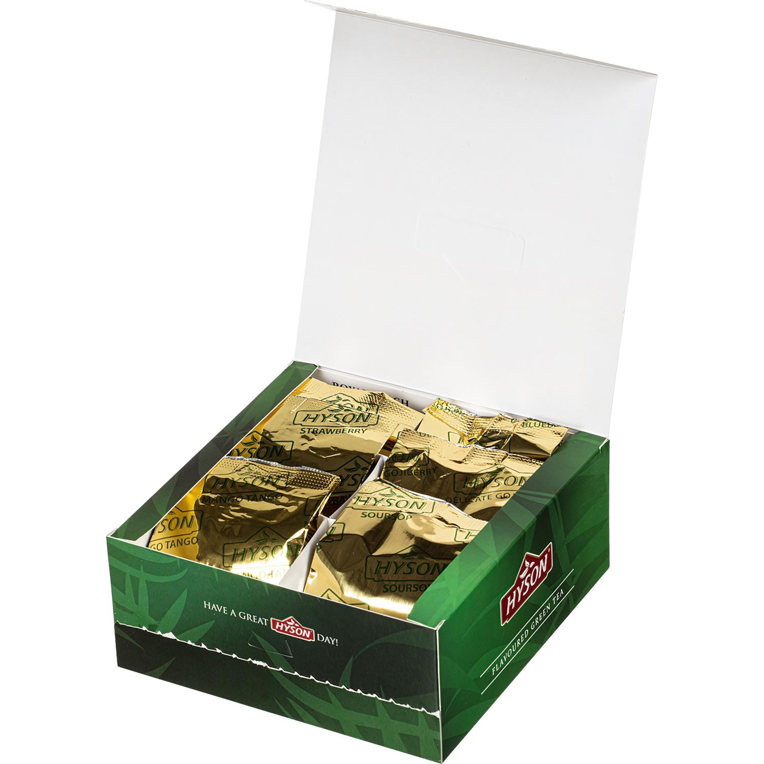 Чай зелёный байховый цейлонский ароматизированный (6 вкусов: Клубника,Персик,Саусеп,Черника,Манго,Ягода Годжи) 6 вкусов по 10 пакетиков в картонной коробке. Картонная коробка и фольгированный пакет. Произведен и упакован на Шри-Ланке Hyson зеленый Gurmet Tea Collection украсит собой множество офисных чаепитий и домашних выходных, даря утонченный вкус и сочный аромат любимых фруктов и ягод. Он способен внести радужные моменты в серые будни и подарить улыбку задумчивому лицу. Так много поводов сделать жизнь красочней и чашка Gurmet Tea Collection - один из них! Для приготовления изысканного напитка вскипятите воду, дайте ей немного остынуть и заварите чайный пакетик на 3 минуты. В упаковке 60 чайных пакетиков, по 10 штук на аромат. Каждый из них упакован в фольгированный конверт, который предотвращает смешивание вкусовых характеристик, а также защищает от влаги, воздуха и посторонних запахов, чтобы каждое чаепитие приносило только яркие эмоции и истинное удовольствие! Состав: смесь зеленого цейлонского и китайского чая с ароматами Клубники, Персика, Саусепа, Черники, Манго, Ягоды Годжи. Способ приготовления: заварить чайный пакетик в чашке или заварочном чайнике кипяченой водой и настоять 3 минуты. Вес: 90 г. Количество пакетиков в упаковке: 60 штук. Тип упаковки: картонная коробка. Условия хранения: хранить в чистом, хорошо вентилируемом помещении без посторонних запахов с относительной влажностью воздуха не выше 70%. Страна производства: Шри-Ланка.