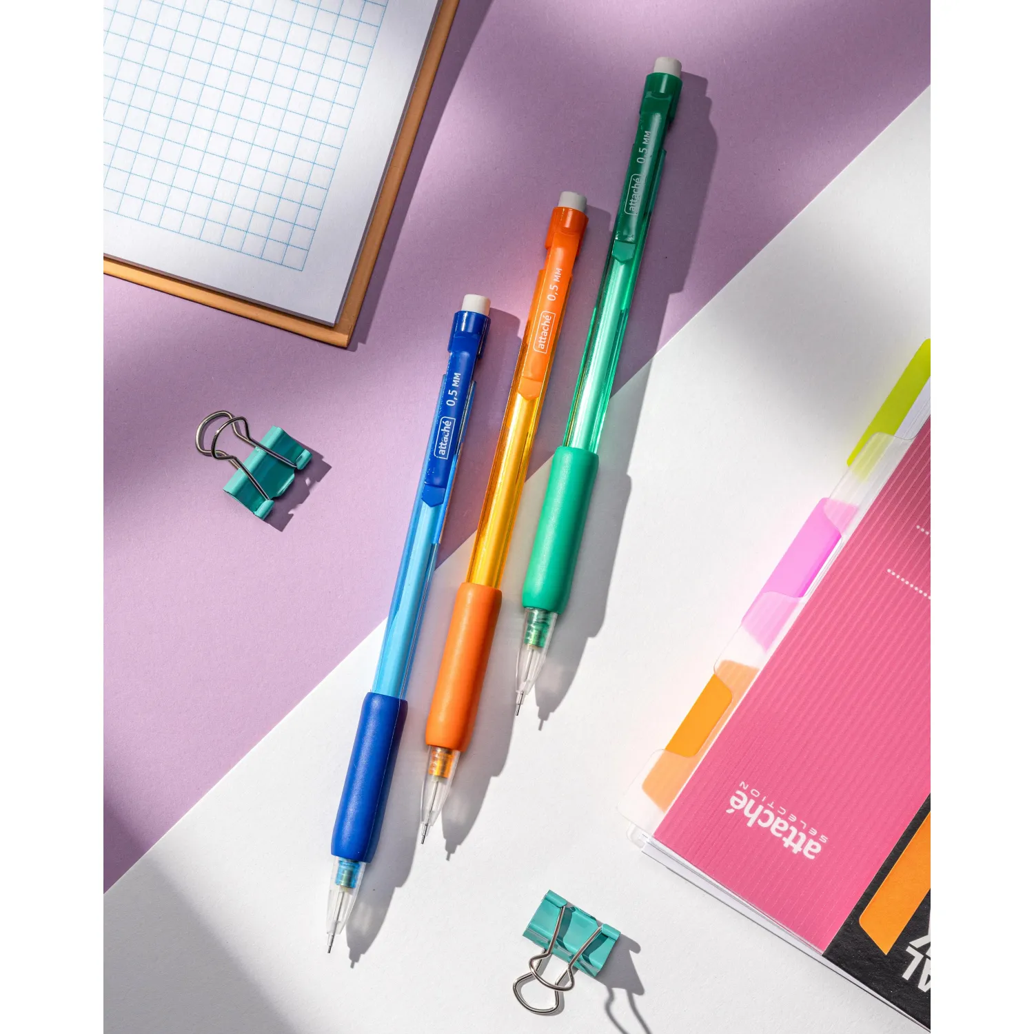 Карандаш механический Attache с толщиной линии письма 0.5 мм. Твердость грифеля НВ. Является отличным помощником в работе над документами и текстами, для рисования, для проведения проектных работ и работ по черчению. Карандаш выполнен в тонированном пластиковом корпусе ярких цветов. Снабжен ластиком и пластиковым клипом, позволяющим закрепить карандаш в кармане или тетради для записей. Мягкая резиновая манжетка обеспечивает комфорт во время письма и препятствует скольжению пальцев. Внимание! Товар поставляется в нескольких вариантах цвета/дизайна (без возможности выбора).