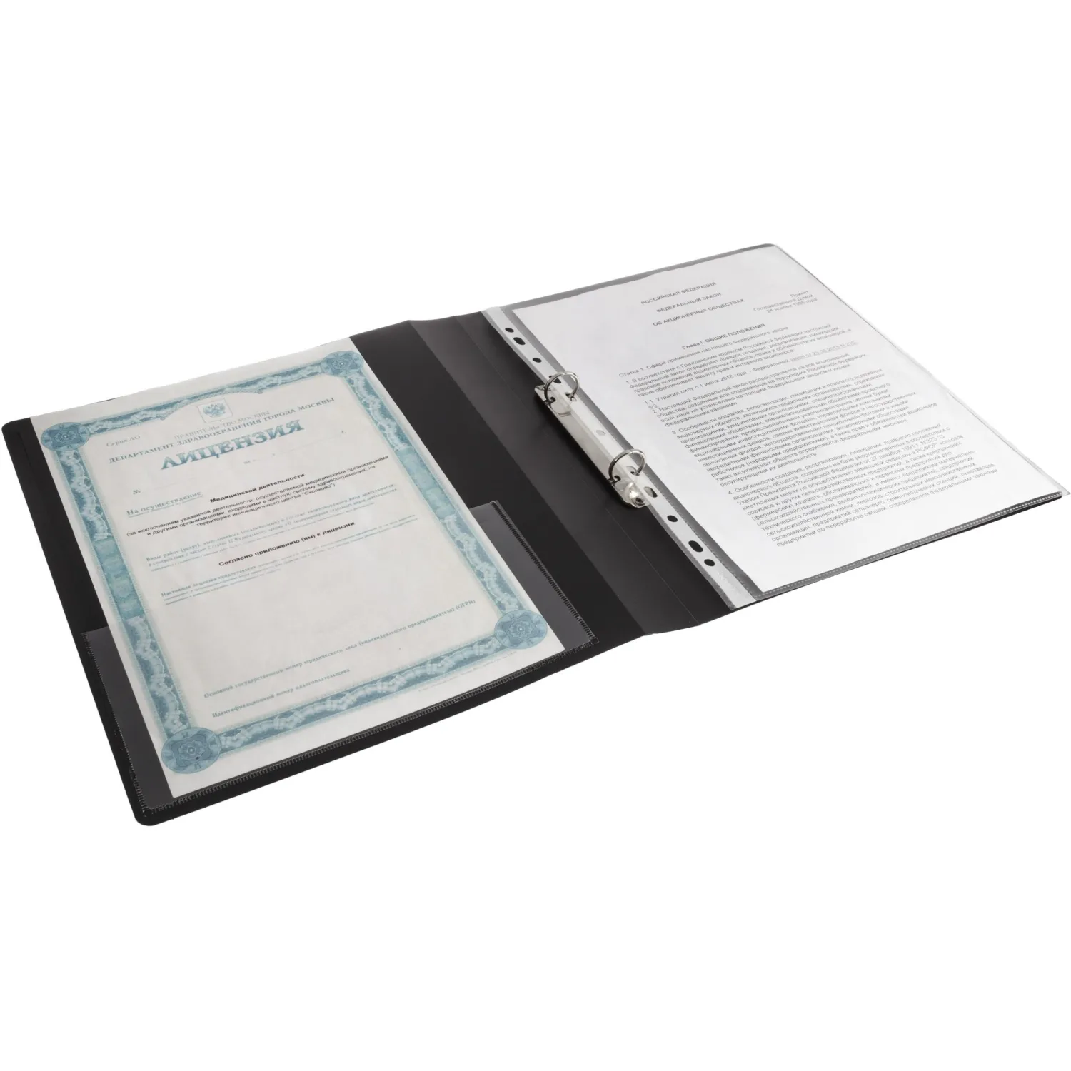 Папка на кольцах рекомендуются как для временного, так и длительного хранения, систематизации, архивирования документов. Такие папки используются в работе офисными сотрудниками различных специальностей, направлений, должностей. Можно использовать для домашних документов. Папка на двух кольцах Attache изготовлена из листового полипропилена толщиной 0,7 мм черного цвета. Формат А4. Снабжена механизмом на двух O-кольцах. Диаметр кольца - 25 мм. На внутренней стороне обложки есть прозрачный карман для документов. Корешок шириной 32 мм имеет карман для сменной этикетки. Папка на кольцах вмещает до 200 листов стандартной плотности.