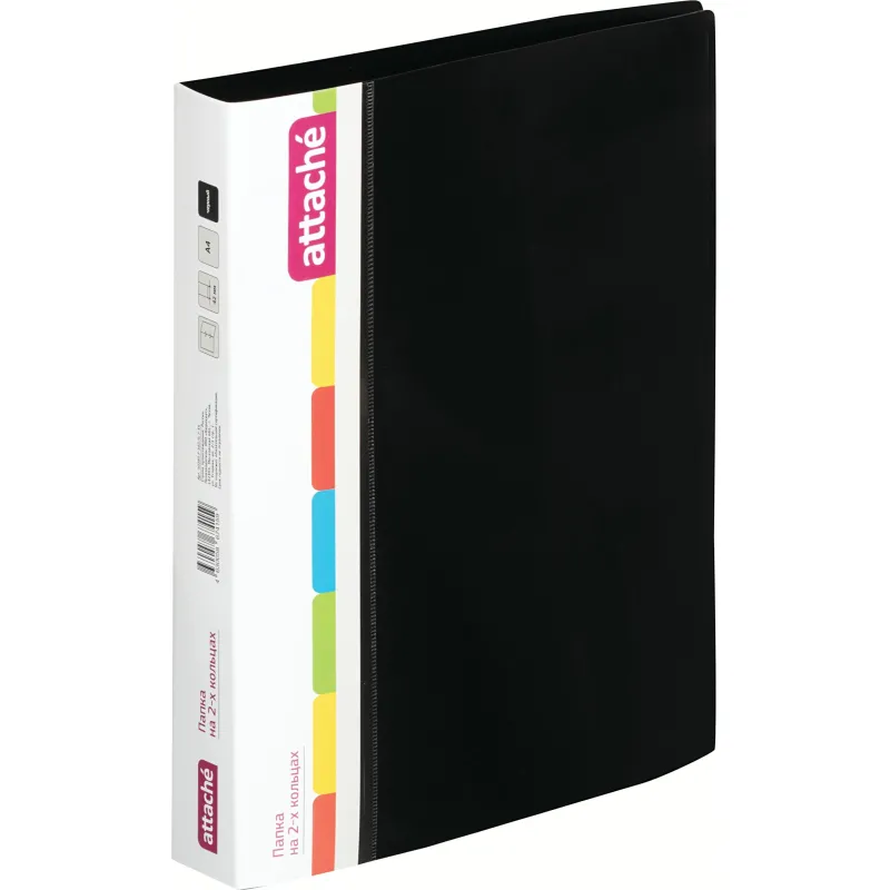 Папка на кольцах рекомендуются как для временного, так и длительного хранения, систематизации, архивирования документов. Такие папки используются в работе офисными сотрудниками различных специальностей, направлений, должностей. Можно использовать для домашних документов.Папка на двух кольцах Attache изготовлена из пластика толщиной 0,7 мм черного цвета. Формат А4. Снабжена механизмом на двух O-кольцах. Диаметр кольца - 35 мм. На внутренней стороне обложки есть прозрачный карман для документов. Корешок шириной 42 мм имеет карман для сменной этикетки. Папка на кольцах вмещает до 250 листов стандартной плотности.