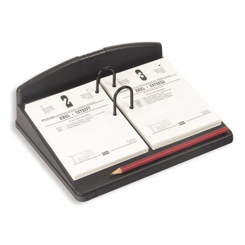 Подставка Uniplast для перекидных календарей изготовлена из пластика черного цвета, размер - 230x180x85 мм. Оснащена двойным дуговым фиксатором и желобком для ручки или карандаша. Расстояние между дужками 4,5 см. Перед использованием необходимо открепить дуги, прикрепленные к обратной стороне подставки клейкой лентой, и вставить их в соответствующие отверстия на лицевой поверхности.