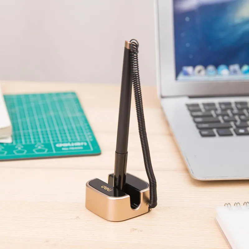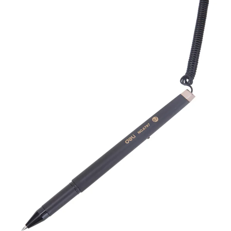 Ручка гелевая с синими чернилами Deli на пружинке и на подставке с регулируемым углом наклона. Диаметр пишущего узла составляет 0,7 мм. Ручка пишет очень тонко и аккуратно. Гелевая ручка на подставке — неотъемлемый атрибут клиентских офисов. Легко крепится к столу с помощью двухстороннего скотча и подойдет для банков, отелей, сервисных центров и других организаций.
