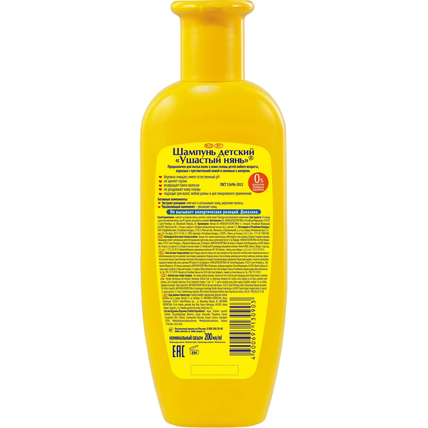 Шампунь детский Ушастый Нянь 200 мл. Предназначен для детей любого возраста, начиная с рождения, а также для взрослых и детей с чувствительной кожей головы и склонных к аллергии. Список с сердечками: - бережно очищает, - подходит для поражении головы молочными корочками, - не щиплет глазки, - не сушит и не раздражает кожу, - придает блеск, - делает волосы послушными, - имеет естественный pH. Активные компоненты: - Экстракт ромашки смягчает и успокаивает кожу, придает блеск волосам. - Увлажняющий компонент поддерживает водно-жировой баланс кожи. Доказано (при использовании в соответствии с рекомендациями производителя). Гиппоаллергенен, не содержит: -щелочь, -краситель, -запрещенные ингредиенты.