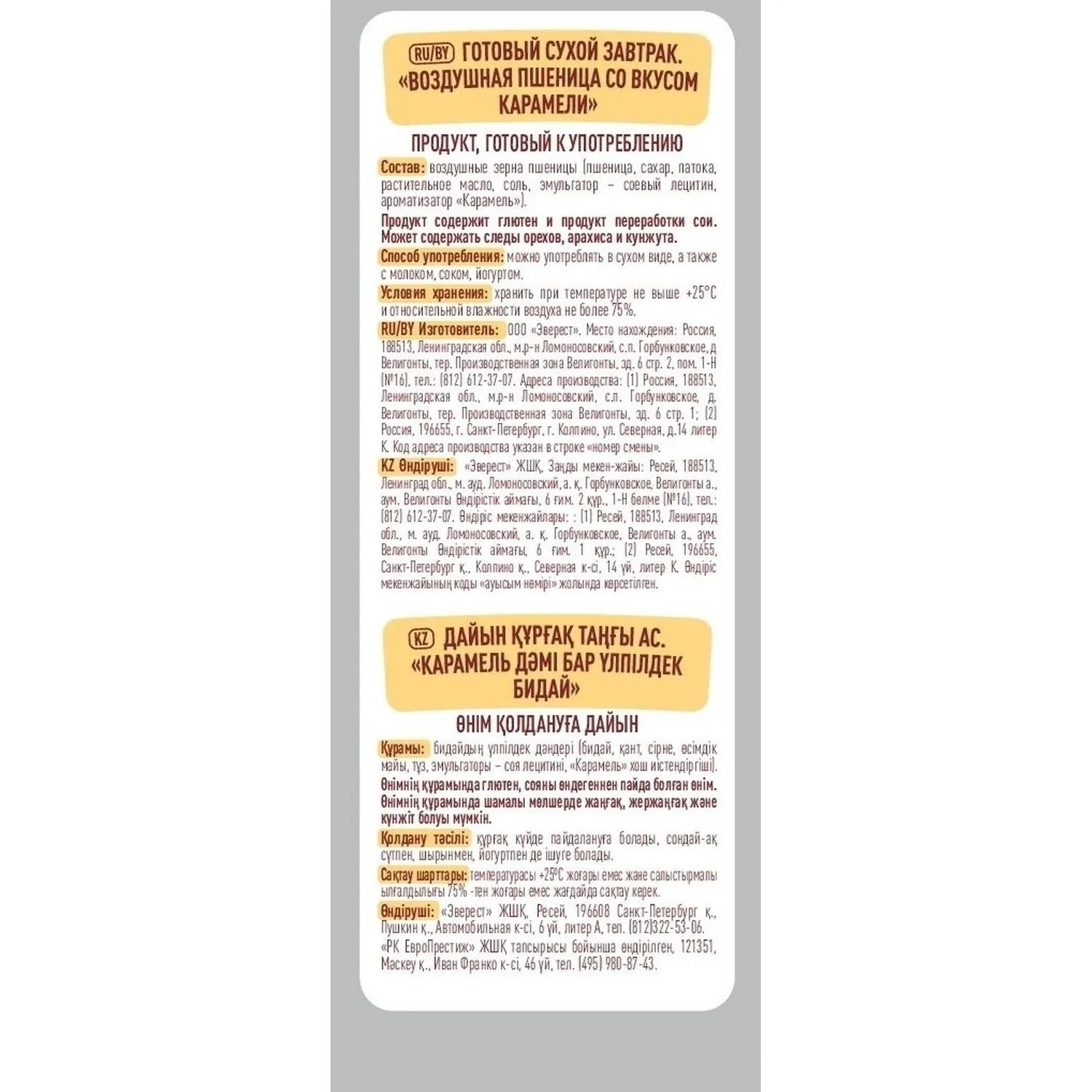 Состав: воздушная пшеница, пшеница, сахар, патока, соль, растительное масло, эмульгатор соевый лецитин, ароматизатор карамель.