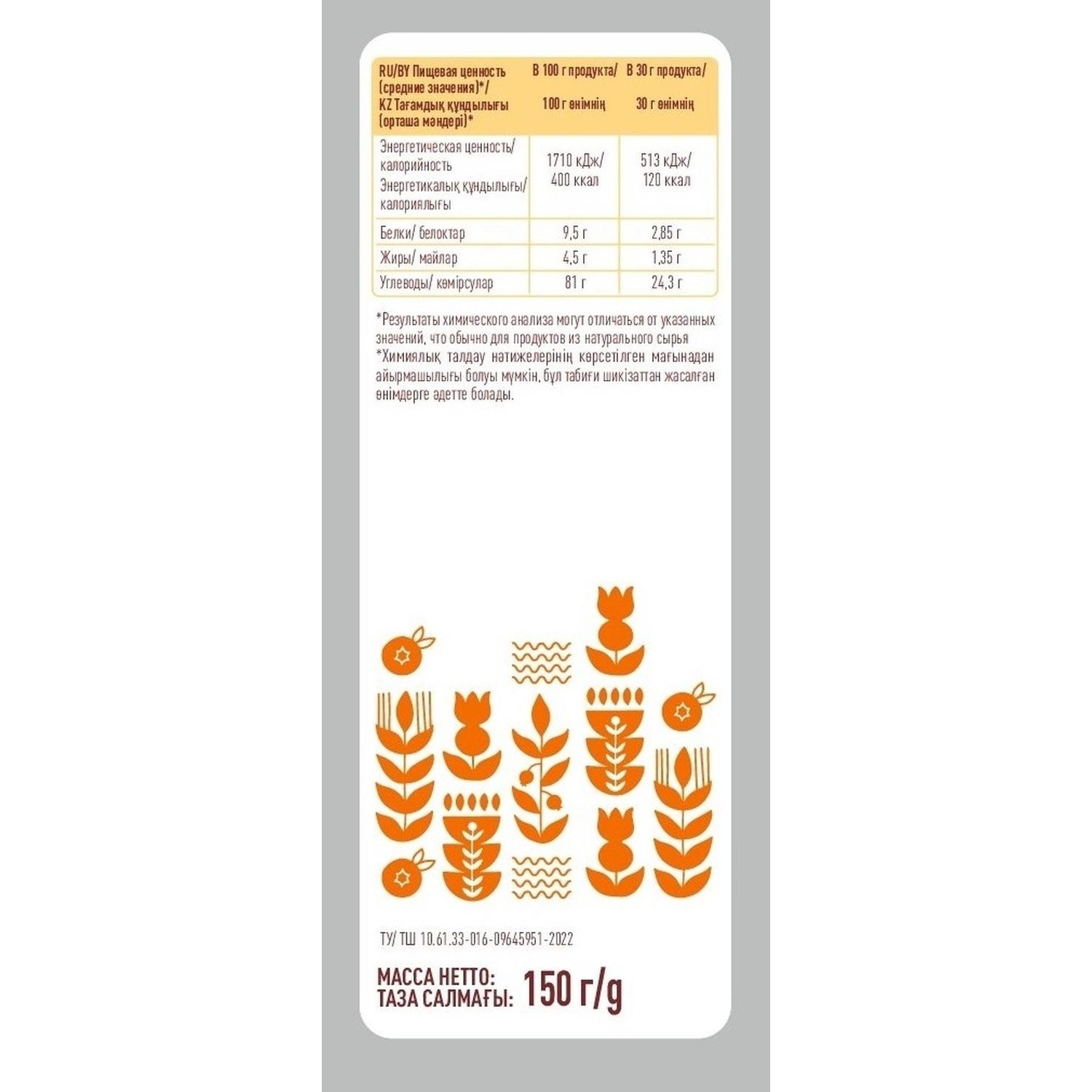 Пищевая ценность: белки 9,5 г, жиры 4,5 г, углеводы 81 г.