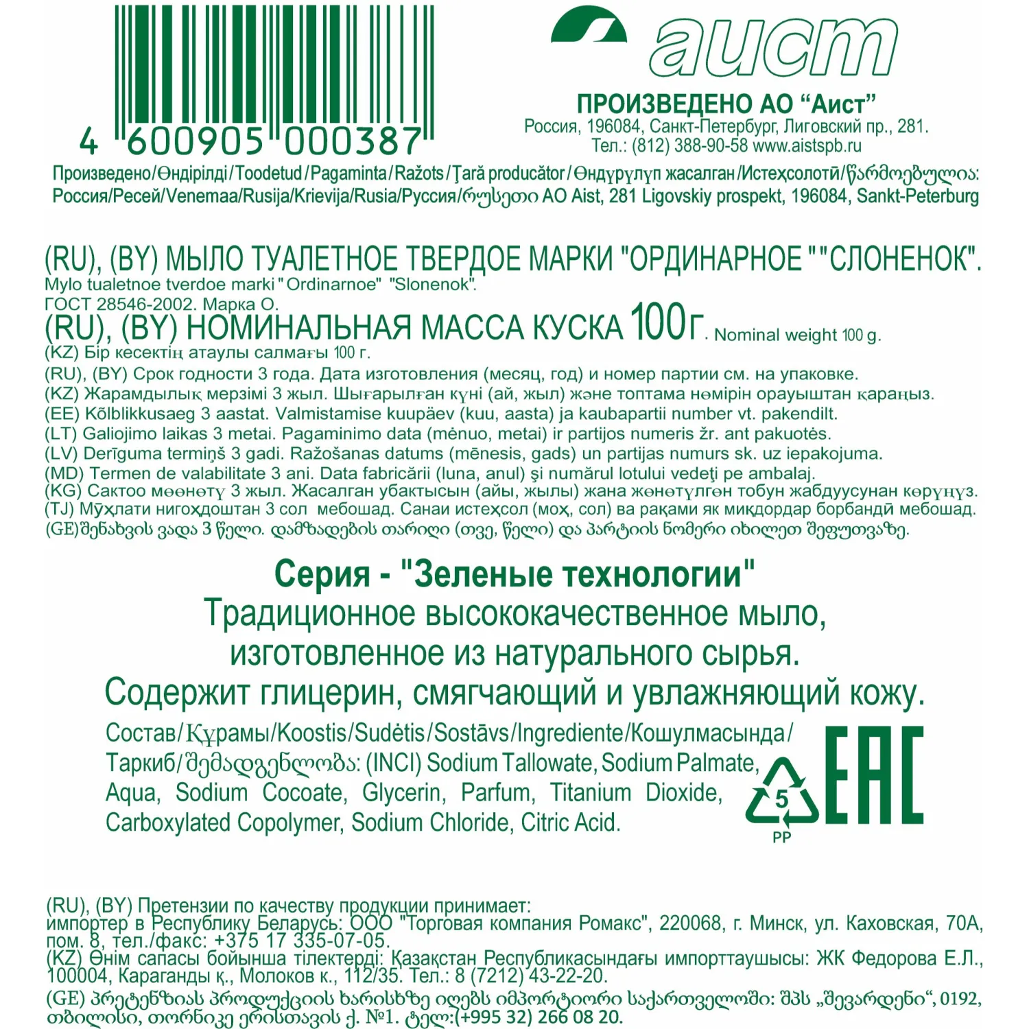 Мыло туалетное Аист Слоненок 100 г. Назначение: Мыло туалетное твердое представляет собой продукт, состоящий из натриевых солей жирных кислот натуральных жиров и масел (кокосового, пальмового, подсолнечного) с добавлением глицерина, пластификаторов, антиоксидантов и смягчающих веществ. Способ применения: Предназначено для целей личной гигиены. Натуральное мыло изготовлено из высококачественных, очищенных жиров и масел. Обладает высокой моющей способностью, мягкой пеной и бережным воздействием на кожу рук, не вызывает аллергических реакций. Не содержит химических ароматизаторов и красителей, является экологически чистым продуктом. Не размокает в воде, не трескается при длительном хранении. Состав: Sodium Tallowate, Sodium Palmate, Aqua, Sodium Cocoate, Glycerin, Parfum, Titanium Dioxide, Сarboxylated Сopolymer, Sodium Chloride, Citric Acid. Условия хранения: твердое туалетное мыло хранят в сухих закрытых хорошо проветриваемых помещениях (на складах применяют активное вентилирование) при температуре не ниже минус 5 °С и относительной влажности не более 75 %. Срок годности: 36 месяцев.