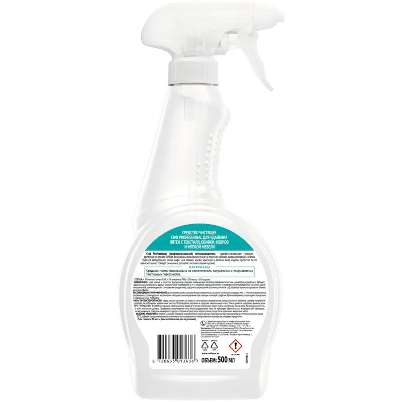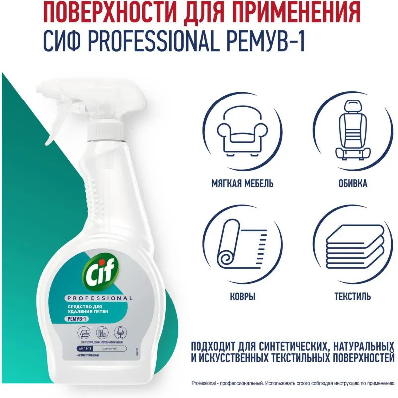 Назначение: Cif Professional — эффективный спрей пятновыводитель для текстиля, обивки, ковров. Удаляет застаревшие пятна кофе, чая, табака, пятен крови, красного и белого вина, соусов на синтетических, натуральных и искусственных текстильных поверхностях. Спрей легко наносится и не требует смывания, оставляет лёгкий свежий аромат.