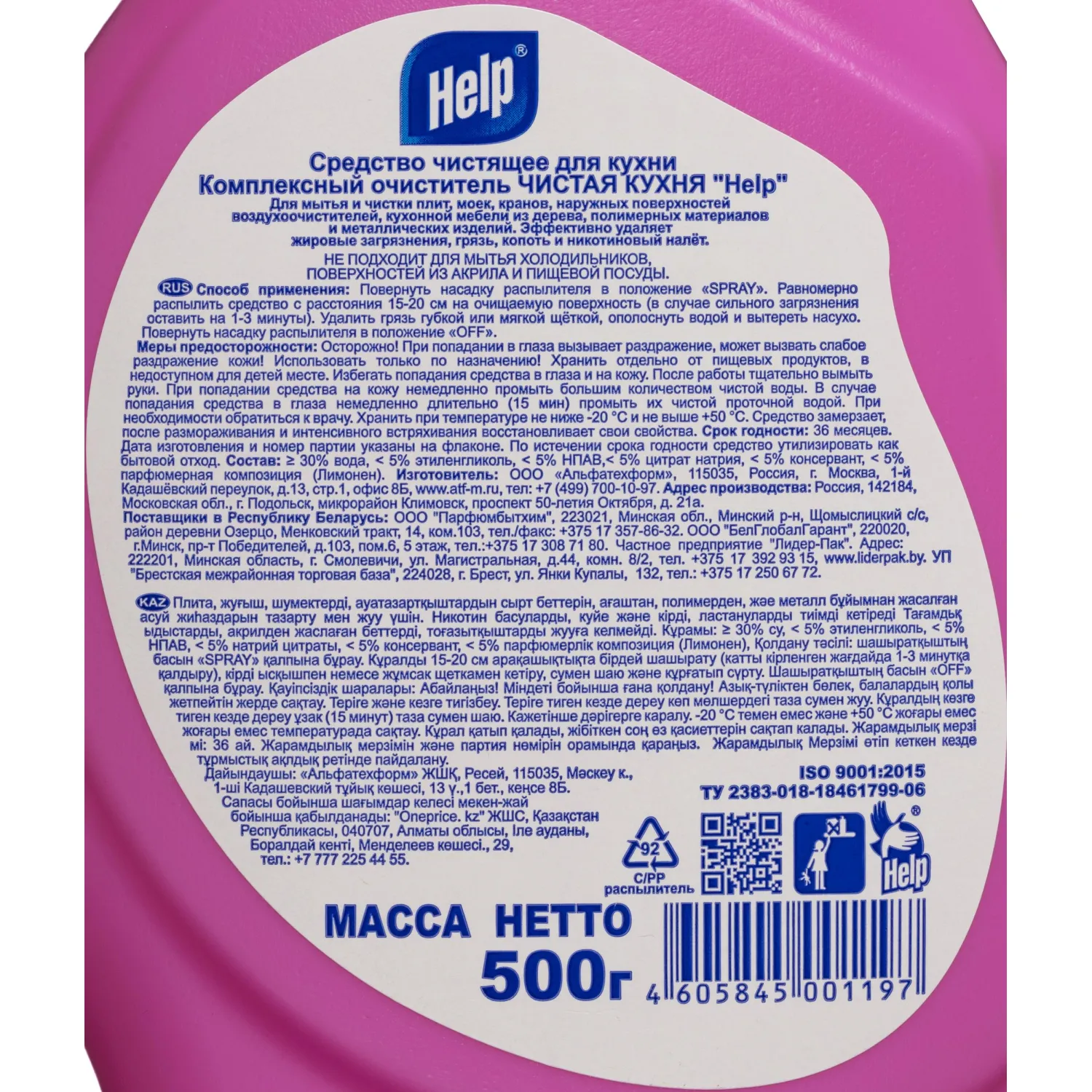 Для мытья и чистки плит, моек, кранов, наружных поверхностей воздухоочистителей, кухонной мебели, мебели из дерева, полимерных материалов и металлических изделий. Эффективно удаляет жировые загрязнения, грязь, копоть и никотиновый налет. Способ применения Повернуть насадку распылителя в положение ",SPRAY",. Равномерно распылить средство с расстояния 15-20 см на очищаемую поверхность (в случае сильного загрязнения оставить на 1-3 минуты). Удалить грязь губкой или мягкой щеткой, ополоснуть водой и вытереть насухо. Повернуть насадку распылителя в положение ",OFF",. Меры предосторожности Не подходит для мытья холодильников, поверхностей из акрила и пищевой посуды. Использовать только по назначению! Хранить отдельно от пищевых продуктов, в недоступном для детей месте. Избегать попадания средства в глаза и на кожу. При попадании средства на кожу немедленно промыть большим количеством чистой воды. В случае попадания средства в глаза немедленно длительно (15 мин) промыть их чистой проточной водой. При необходимости обратиться к врачу. Состав: ?30% вода, <5% этиленгликоль, <5% НПАВ, <5% цитрат натрия, <5% консервант, <5% парфюмерная композиция (лимонен).