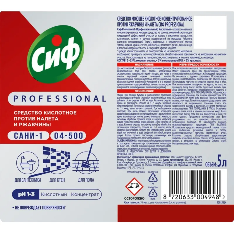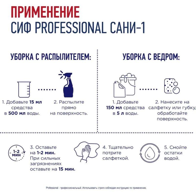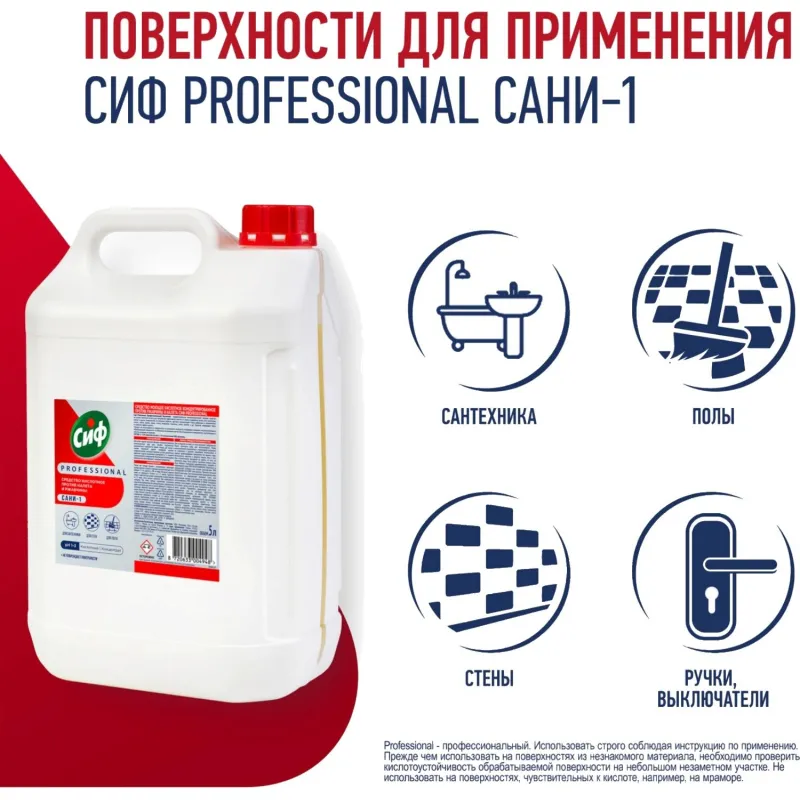 Моющее средство Cif Professional подходит для уборки в туалете и ванной комнате: для чистки унитазов и раковин, канализационных труб. Кислотное средство Cif можно использовать на хромированных, керамических, эмалированных (кроме посуды) и стеклянных поверхностях, а также поверхностях из нержавеющей стали.
