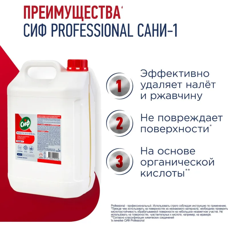 В состав Cif Professional входит лимонная кислота, которая эффективно борется с налетом (даже на сильно загрязненных поверхностях) и ржавчиной, оставляя чистоту и свежесть на длительное время. Большой объем и концентрированная формула позволяют экономно расходовать средство, которого хватит надолго.