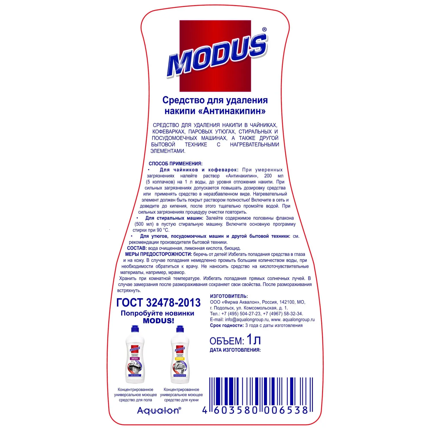 Средство для удаления накипи Modus Антинакипин универсальное жидкость 1 л. Назначение. Высокоэффективное средство для удаления накипи в чайниках, кофеварках, паровых утюгах, стиральных и посудомоечных машинах, а также другой бытовой технике с нагревательными элементами. Использование щадящих кислот не требует тщательной промывки бытовой техники после применения. Способ применения. Для чайников и кофеварок: при умеренных загрязнениях налейте раствор Антинакипин (200 мл на 1 л воды) до уровня отложения накипи. При сильных загрязнениях допускается повышать дозировку средства или применять в неразбавленном виде. Нагревательный элемент должен быть покрыт раствором полностью! Включите в сеть и доведите до кипения, после этого тщательно промойте водой. При сильных загрязнениях процедуру повторить.Для стиральных машин: залейте 450 мл в пустую стиральную машину. Включите основную программу стирки при 90°C.Для утюгов, посудомоечных машин и другой бытовой техники: смотрите рекомендации производителя бытовой техники. Меры предосторожности. Беречь от детей. Избегать попадания средства в глаза и на кожу. В случае попадания немедленно промыть большим количеством воды, при необходимости обратиться к врачу. Не наносить средство на кислоточувствительные материалы, например, мрамор. Состав. Очищенная вода, лимонная кислота 5-15%, биоцид <5%.ГОСТ/ТУ.ГОСТ 32478-2013. Условия хранения. Хранить при комнатной температуре. Избегать попадания прямых солнечных лучей. В случае замерзания после размораживания сохраняет свои свойства. После размораживания встряхнуть. Срок годности. 3 года с даты изготовления.