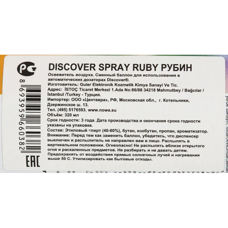 Сменный баллон для автоматического освежителя Discover Ruby Яблоко 320 мл Прекрасно освежает воздух и устраняет неприятные запахи, поддерживает гигиеническую чистоту, создает атмосферу уюта. Аромат фруктовый: зеленое яблоко. Объем баллончика со спреем - 320 мл. Один баллон освежителя воздуха рассчитан на 3200 распылений, что позволяет освежать помещение до 3-х месяцев (при средней интенсивности использования). Места применения: жилая комната, офис, ресторан, туалет, ванная, холл, магазин, спортивный зал и т.д. Один спрей рассчитан на освежение помещения площадью до 120 кв. м. Размер: 15,7x6,5x6,5. Является расходным материалом для автоматического освежителя воздуха Discover. Способ применения: поместите внутрь корпуса аэрозольный баллончик с ароматом так, чтобы нажимной рычажок механизма оказался над носиком баллона. Внимание! Не направляйте баллончик в лицо - при установке возможно автоматическое распыление освежителя! Меры предосторожности: Огнеопасно! Баллон под давлением. Не распылять и не устанавливать вблизи источников тепла, открытого огня или искр, раскаленных предметов, электрического оборудования и под прямыми солнечными лучами - в любых местах, где работающая система может нагреваться свыше 50°С. Не курить во время применения! Не разбирать, не сжигать и не прокалывать баллон даже после использования. Не допускать попадания в глаза! При попадании в глаза осторожно промыть большим количеством воды, при наличии линз удалить их и продолжить промывание. В случае попадания на кожу смыть теплой водой, при появлении раздражения или проглатывании - обратиться к врачу. Использовать только по прямому назначению. Применение в пищевых целях опасно для жизни и здоровья! Состав: этиловый спирт 40%-60%, бутан, изобутан, пропан, ароматизатор. Условия хранения: хранить в недоступном для детей месте при температуре не выше 50°С. Утилизировать как бытовой отход. Гарантийный срок: 5 лет.