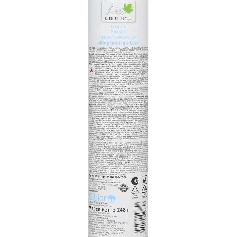 Освежитель воздуха LIS Морской прибой 300 мл Назначение/особенности: Освежитель воздуха создает ощущение свежести и чистоты на длительное время. Устраняет неприятные запахи и наполняет воздух свежим ароматом. Создает комфортную атмосферу при работе и отдыхе. Высокая эффективность и стойкий аромат для контроля неприятных запахов. Подходит для туалетных комнат площадью до 20 кв. м. Способ применения: Хорошо встряхнуть баллон несколько раз, нажать на клапан и в течение нескольких секунд распылить освежитель в воздух, направив струю аэрозоля вверх и в разные стороны. Внимание! При распылении следует избегать попадания аэрозоля на стены и на предметы интерьера. Баллон при распылении не переворачивать! Меры предосторожности: Использовать только по назначению! Осторожно! Воспламеняется! Не распылять вблизи открытого огня и раскаленных предметов! Предохранять от воздействия прямых солнечных лучей и нагревания выше +40°C! Баллон под давлением! Не вскрывать и не сжигать баллон даже после использования! Не допускать попадания в глаза! При попадании в глаза немедленно промыть их чистой водой! При необходимости обратиться к врачу! Избегать попадания на кожу! Не вдыхать! Не глотать! Беречь от детей! Состав: Вода, бутан/пропан/изобутан смесь 15%-30%, отдушка <5%, сорбитанолеат <5%, метилизотиазолинон (и) хлорметилизотиазолинон <5%, триэтиленгликоль <5%, нитрит натрия <5%. Условия хранения: Хранить отдельно от пищевых продуктов в сухом прохладном месте, недоступном для детей. После использования утилизировать как бытовой отход. Срок годности: 36 месяцев.