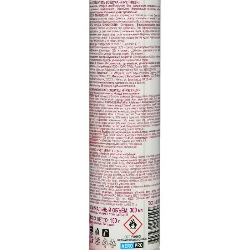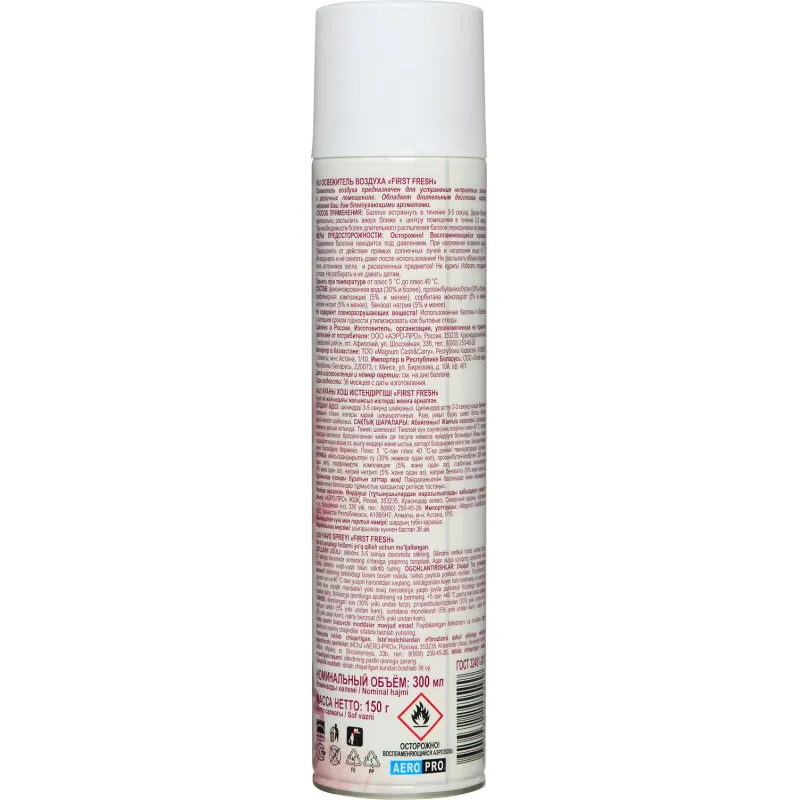 Освежитель воздуха First Fresh Антитабак 300 мл.Освежитель First Fresh Антитабак 300 мл — аэрозольный освежитель воздуха, который способен устранить запах табака всего одним распылением. Данный освежитель имеет в своем составе специальный компонент, который позволяет ликвидировать запах табака на очень длительное время.Назначение: предназначается для использования в помещениях, где регулярно курят.Способ применения: хорошо встряхнуть баллон несколько раз, нажать на клапан и в течение нескольких секунд распылить освежитель в воздух, направив струю аэрозоля вверх и в разные стороны.Меры предосторожности: ОГНЕОПАСНО! Баллон под давлением. Не устанавливать вблизи источников тепла, огня или искр, электрического оборудования и под прямыми солнечными лучами — в любых местах, где работающая система может нагреваться свыше 50°С. Не распылять вблизи открытого огня и раскаленных предметов. Не курить! Не разбирать, не сжигать и не прокалывать баллон даже после использования. В случае попадания на кожу смыть теплой водой, при появлении раздражения или проглатывании — обратиться к врачу. При попадании в глаза осторожно промыть большим количеством воды, при наличии линз удалить их и продолжить промывание. Использовать баллон только по прямому назначению.Состав: вода деионизированная (30% и более), пропан/ бутан/ изобутан (30% и более), парфюмерная композиция (5% и менее), сорбитан олеат (5% и менее), натрия нитрит (5% и менее), линалоол (5% и менее).Условия хранения: хранить в недоступном для детей месте при температуре от -20°С до 40°С. После использования утилизировать как бытовой отход.Срок годности: 36 месяцев.