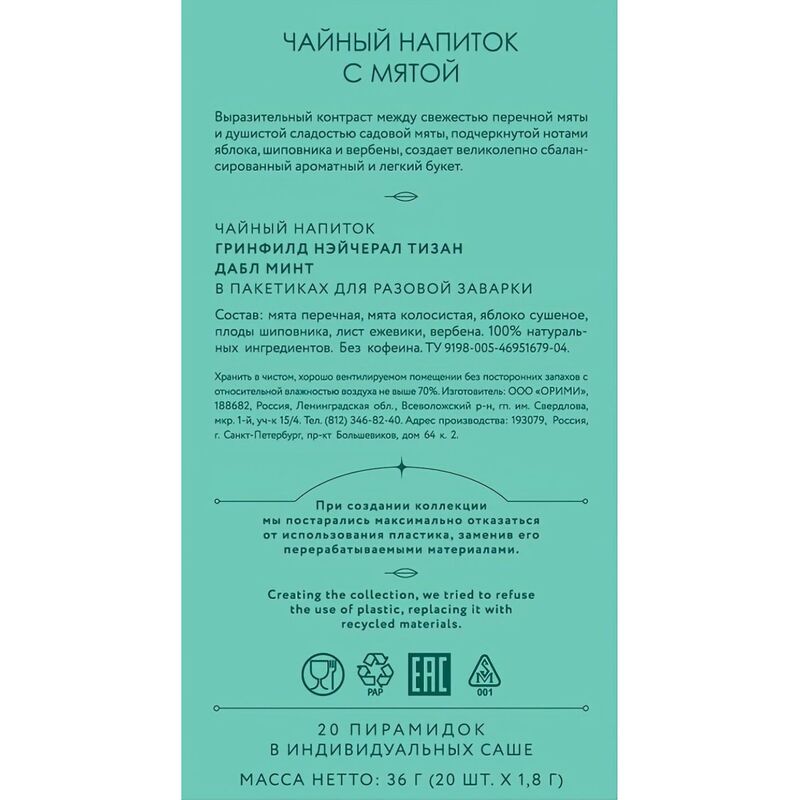 Чайный напиток травяной Greenfield Natural Tisane Double Mint 20 пирамидок. Купаж сладкой садовой и свежей перечной мяты, с добавлением яблока, шиповника и листьев вербены. Охлаждающий и освежающий напиток, прекрасно подходит для потребления в холодном виде!