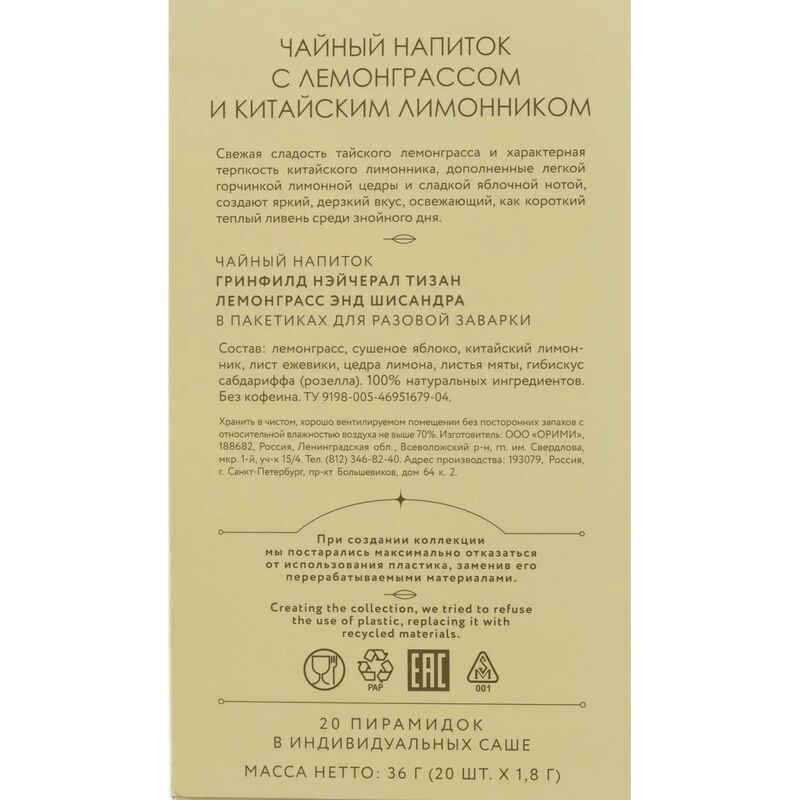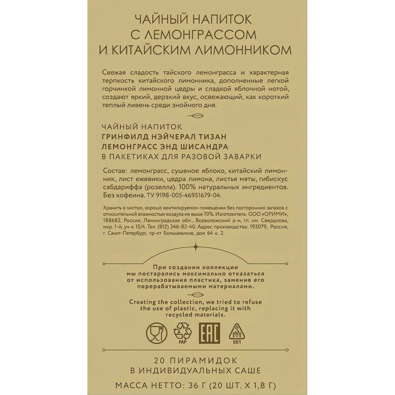 Чай травяной Greenfield Natural Tisane Lemongrass & Schisandra 20 пакетиков. Чай на основе тайского лемонграсса с сочной кислинкой лимонника китайского (шисандры). Сладкий, освежающий. Это первая в мире комбинация таких ярких и самостоятельных ингредиентов в одном купаже. Тайский, богатый цитрусовыми эфирами лимонник, белый легкий кислинкой гибискус, сладкая балансирующая кислотность купажа китайская ежевика. Настоящая азиатская бомба мирового уровня!