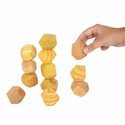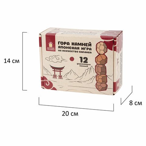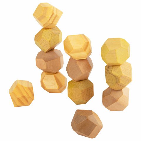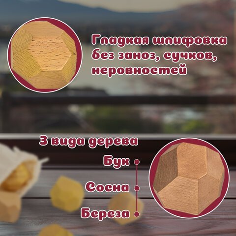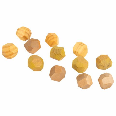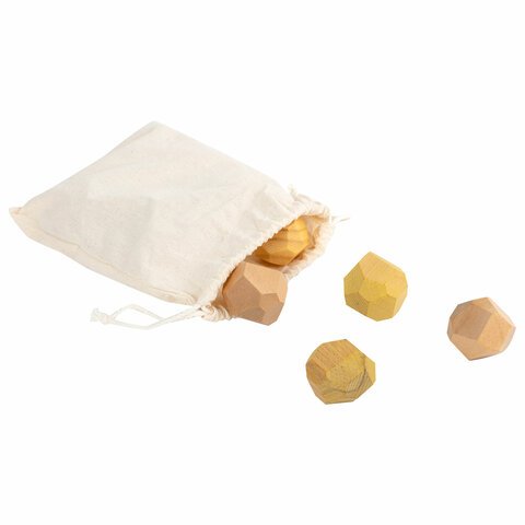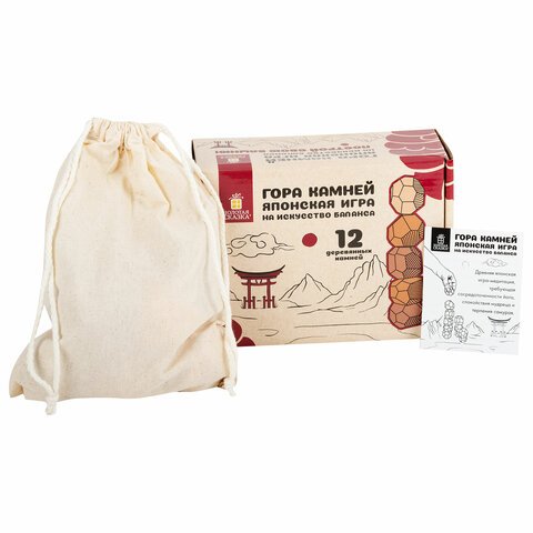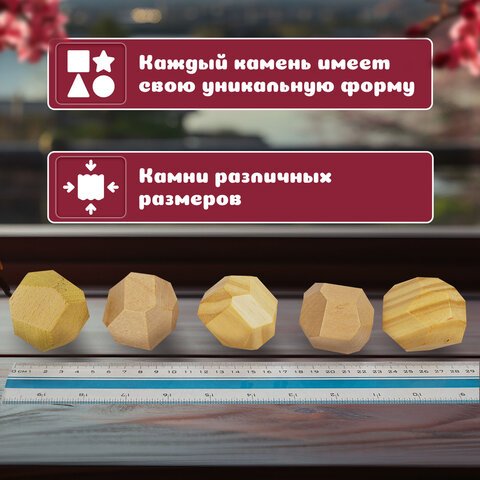 В набор входят 12 деревянных камней различной формы и размеров из трех пород дерева (береза, бук, сосна), льняной мешочек для хранения.