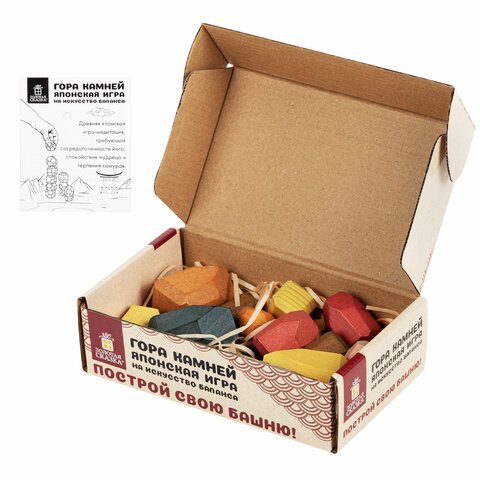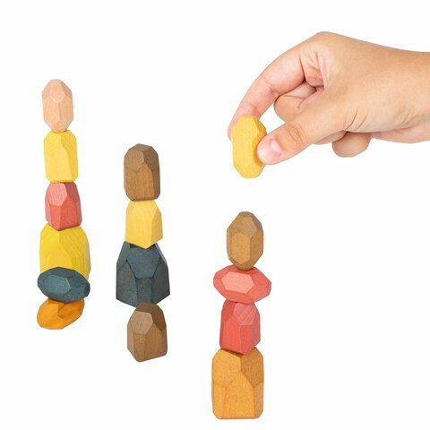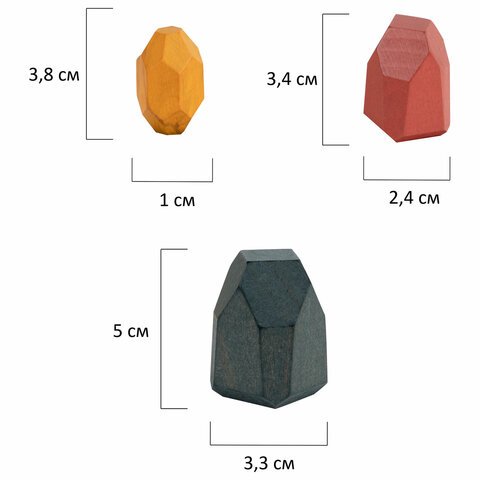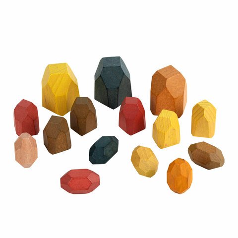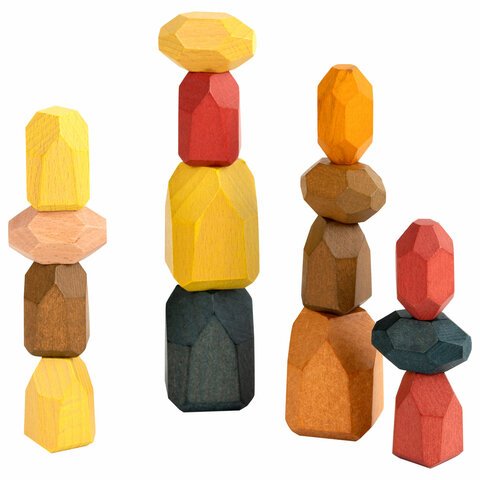 В набор входят 15 деревянных окрашенных камней из бука различной формы, размеров и цветов.
