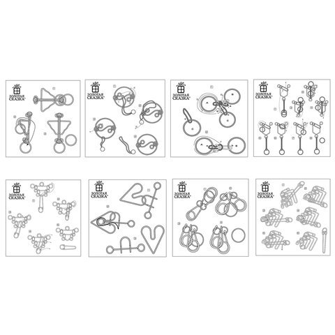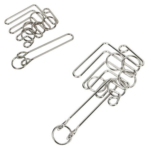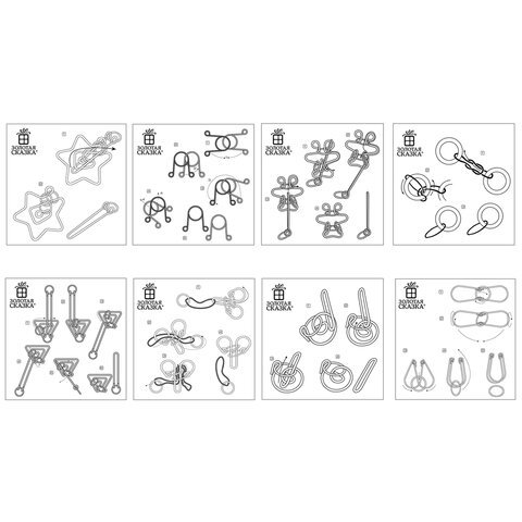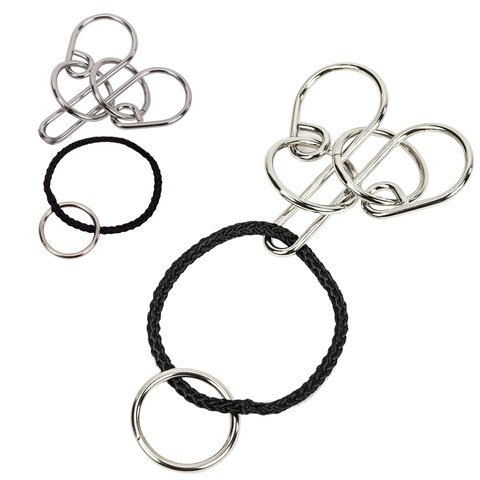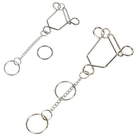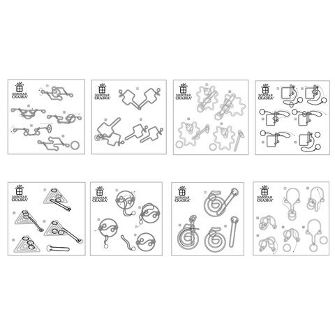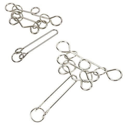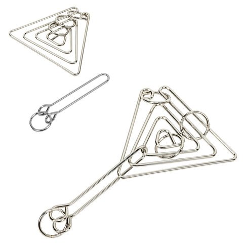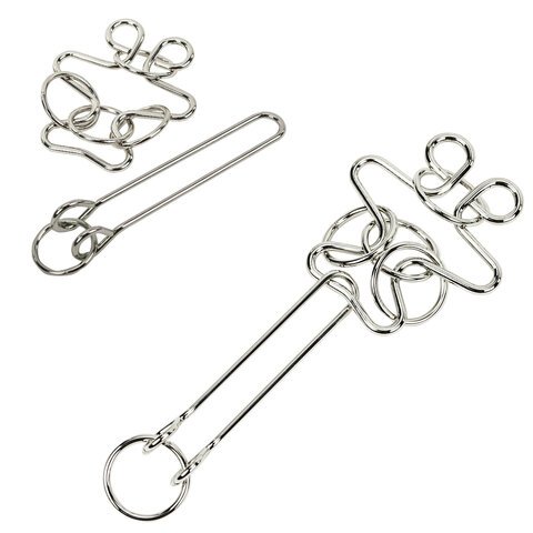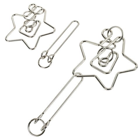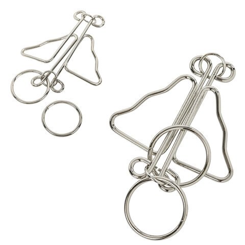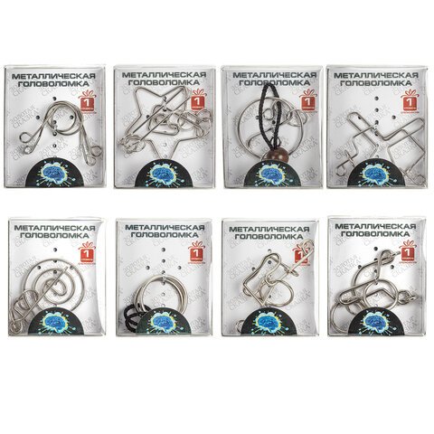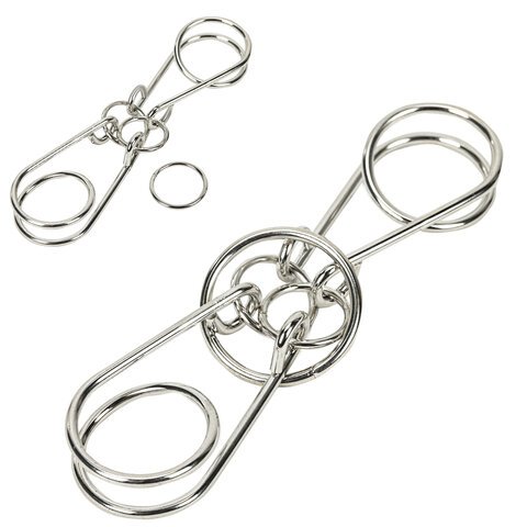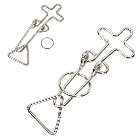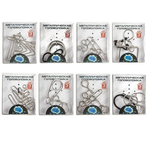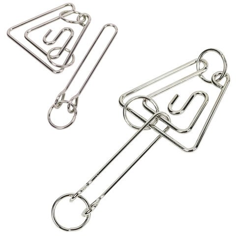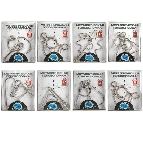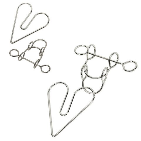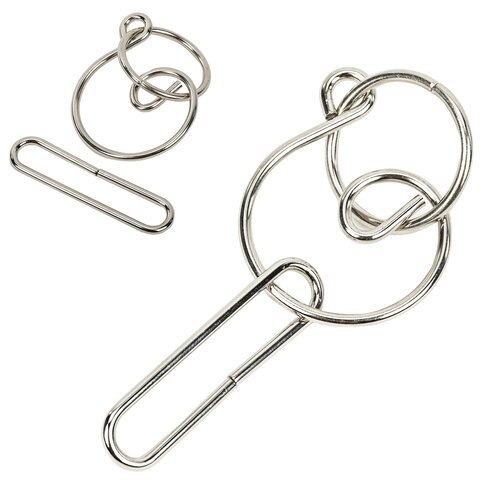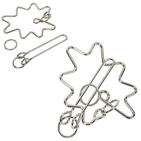 Металлический пазл представляет собой два и более элементов, изготовленных из стали диаметром 2,5 мм. Смысл решения головоломки состоит в том, чтобы разъединить ее части, а затем соединить обратно.