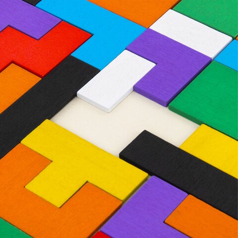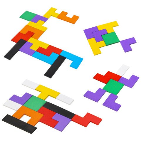 Головоломка состоит из 40 деревянных фигурок различных форм, которые нужно правильно сочетать, чтобы создать разнообразные композиции.