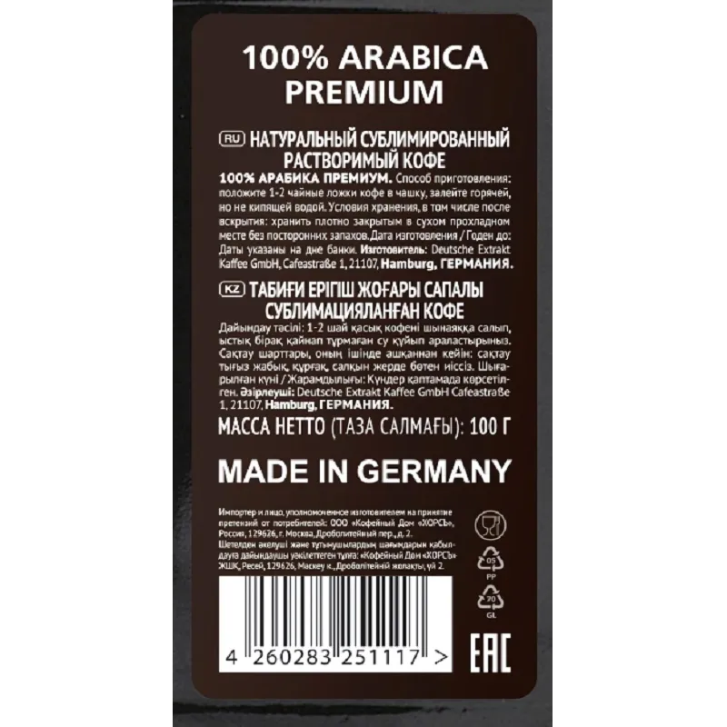 Способ приготовления: положите 1-2 чайные ложки кофе в чашку, залейте горячей, но не кипящей водой.