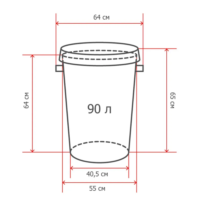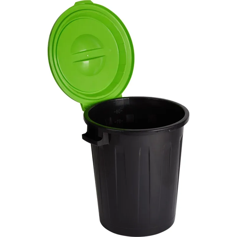Бак для отходов 90 л пластиковый черный 90-ти литровый пластиковый контейнер (бак для мусора) с яркой крышкой. Крышка крепится к баку на специальных петлях-защелках, что позволяет ей перекидываться и держаться на петлях. Есть удобные ручки для переноски. Бак вместителен, прочен, устойчив к ударам, легко очищается, не сохраняет нежелательных запахов. Изделие можно использовать для хранения воды, мусора, компоста, в качестве емкости для сыпучих строительных материалов. Высота бака: 65 см Диаметр: 55 см Ширина с ручками: 64 см Цвет: черный, цвет крышки: зеленый Вес: 2.9 кг.