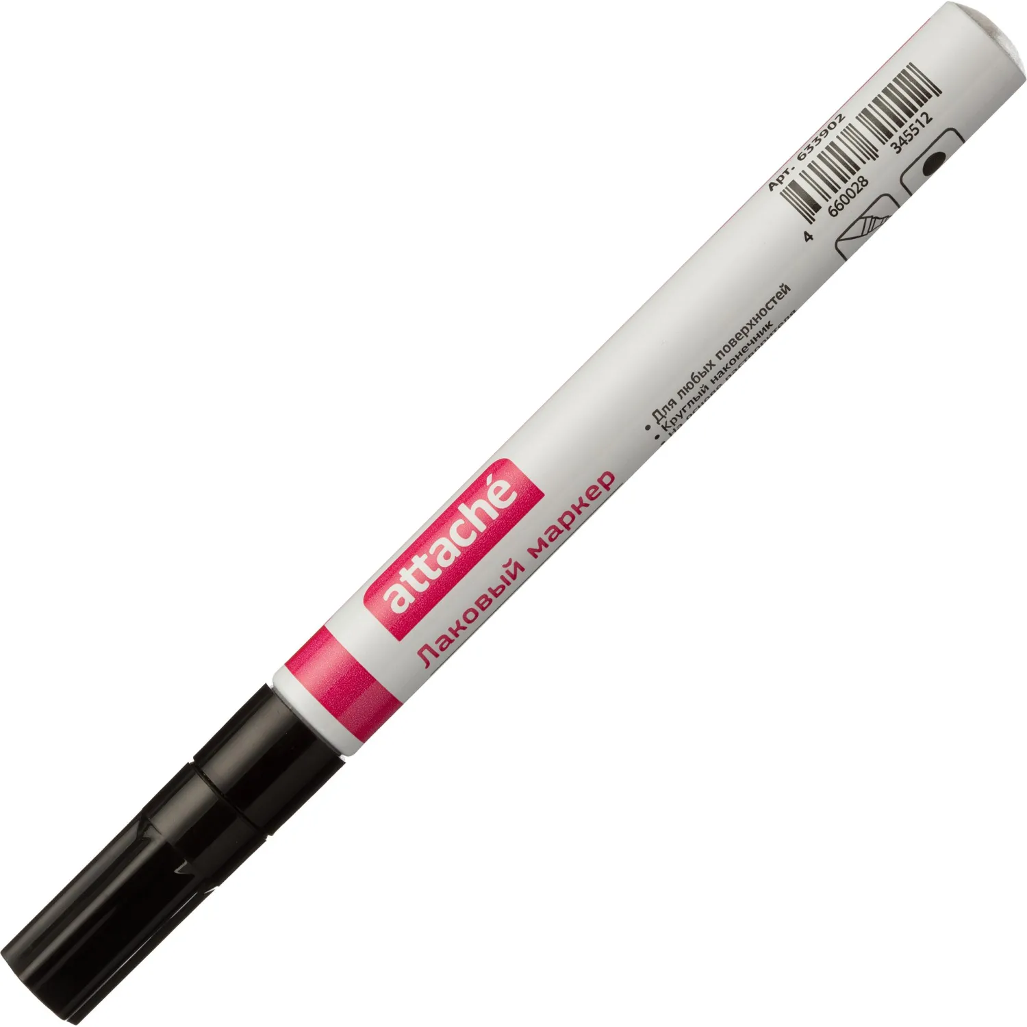Маркер лаковый Attache черный предназначен для непрозрачной маркировки практически всех материалов, например, стекла, пластика, дерева или металла. Чернила маркера с лакирующим эффектом. Водостойкий, быстро сохнет. Поток чернил регулируется клапаном. Алюминиевый корпус. Толщина линии - 2 мм. Количество краски - 4 г. Наконечник изготовлен из Японского качественного материала.Инструкция по применению маркера:1. Перед использованием хорошенько встряхнуть с закрытым колпачком.2. Снимите колпачок, прижмите наконечник к поверхности, надавите и удерживайте пока не проступит краска.3. Применять после того как убедитесь, что вытекает исходный цвет. Предостережения: плотно закрывайте колпачок после применения, держать маркер вдали от огня, прямые солнечные лучи вызывают обесцвечивание.