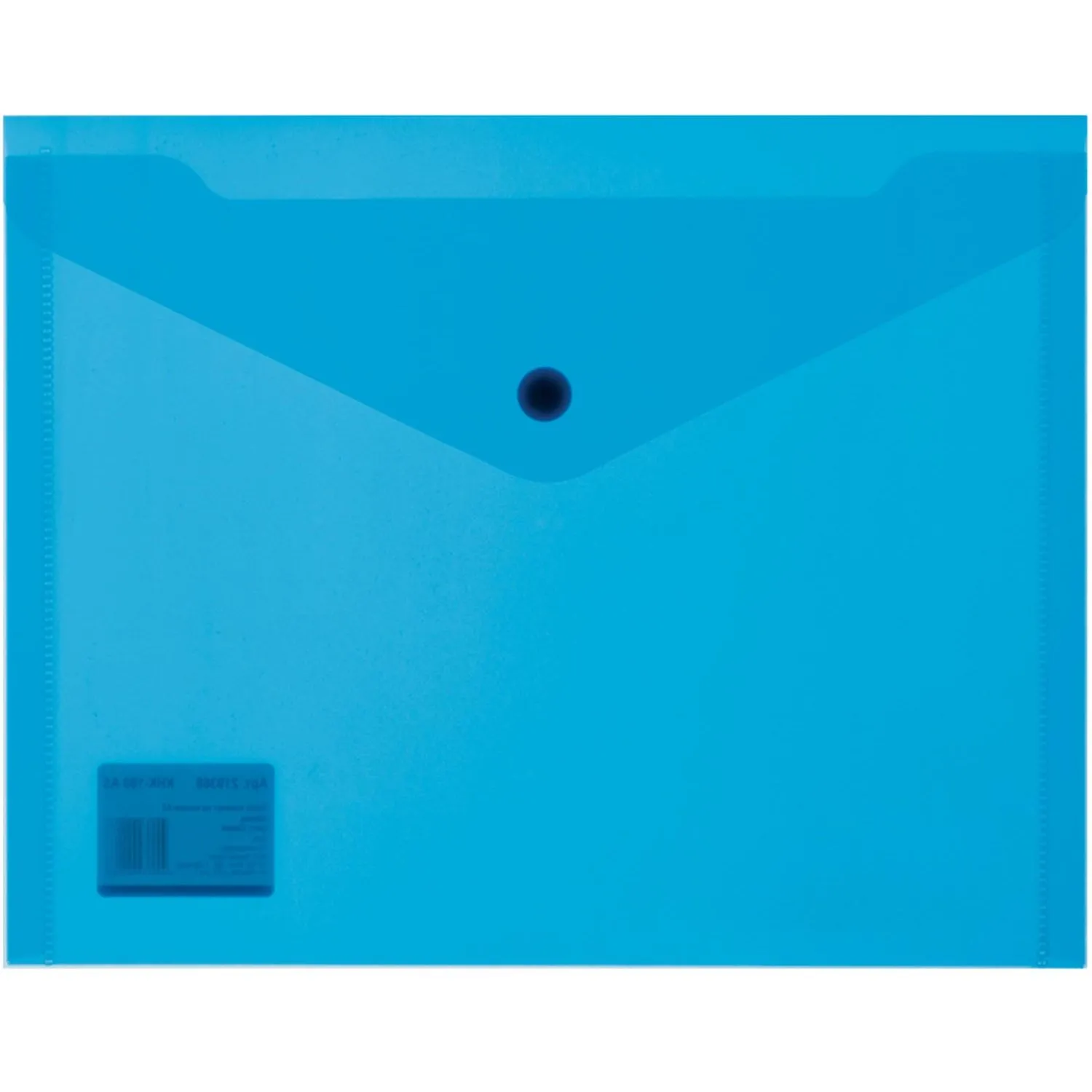 Папка-конверт размером формата А5 изготовлена из прозрачного пластика толщиной 0,18 мм синего цвета. Закрывается на кнопку. Вмещает до 120 листов. Удобна для хранения и переноски документов, предотвращает их смятие и загрязнение. Размер: 19х24 см.