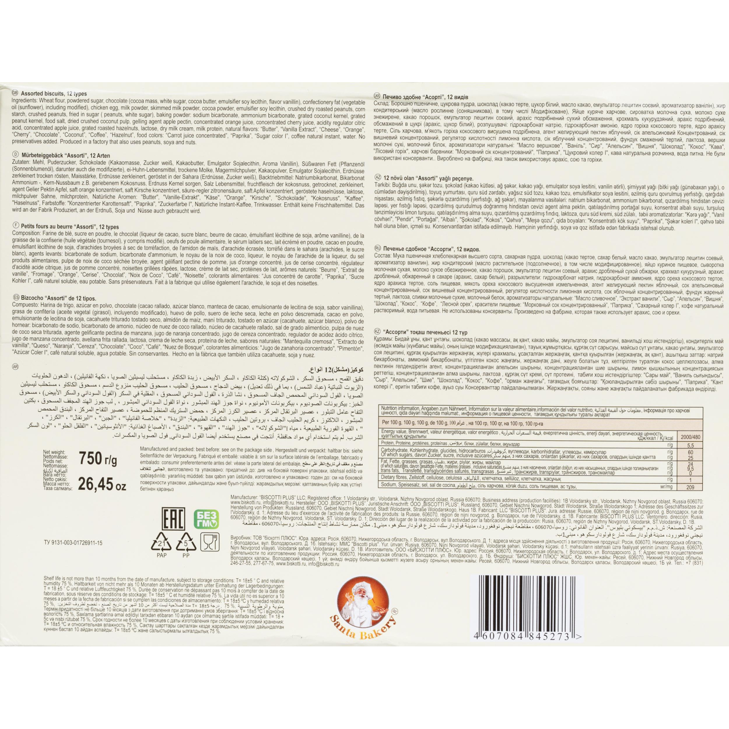 Печенье сдобное Бискотти ассорти 750 гАссорти Бискотти включает разнообразие яркого, красивого, вкуснейшего печенья. Это лучший вариант для знакомства с множеством достойных видов печенья Бискотти, способный подарить приятные впечатление и настоящее удовольствие от наслаждения прекрасным лакомством. Презентабельная фирменная упаковка с 12 видами печенья внесёт праздничную атмосферу в домашнее чаепитие, а также послужит жестом внимания, благодарности, любви и заботы к дорогим и близким людям. Ассорти включает печенье Коста Браво апельсин и вишня (сдобное печенье с апельсиновым и вишнёвым мармеладом, покрытое шоколадной глазурью), разнообразные бискотти: с апельсиновым и вишнёвым мармеладом, кремом, орехами, кокосом, и шоколадом, а также рассыпчатое печенье Нежное и сдобное Неробьянко с шоколадной глазурью.Состав: мука пшеничная в/с, сахарная пудра, молочный шоколад (сахар, какао-масло, молоко сухое цельное, какао тёртое, сыворотка сухая молочная, эмульгатор лецитин, ароматизатор ванилин), жир растительный, начинка — масса молочная (сахар, жир растительный, молоко сухое обезжиренное, эмульгатор лецитин, антиокислитель токоферолы), начинка-масса ореховая (сахар, жир растительный, какао-порошок, сыворотка сухая молочная, ядро ореха фундука жареное тёртое, эмульгатор лецитин, ароматизаторы: Лесной орех, Шоколад идентичные натуральным, антиокислитель токоферолы), яйцо куриное пищевое, начинка- масса кокосовая (сахар, жир растительный, молоко сухое обезжиренное, ядро кокосового ореха высушенное дроблёное, эмульгатор лецитин, ароматизатор Кокос идентичный натуральному, антиокислитель токоферолы), орех дроблёный, обжаренный в сахаре, орех дроблёный сухой обжарки, крахмал кукурузный, разрыхлители: пирофосфат динатрия, сода пищевая, сухой глюкозный сироп, какао-порошок, кокос тёртый, эмульгаторы: лецитин, моно и диглицериды жирных кислот, лактилат натрия, паста фундучная, белок молочный, соль пищевая, мякоть ореха кокосового высушенная измельчённая, желеобразователь пектин, сок апельсиновый концентрированный, молоко сухое обезжиренное, сок вишнёвый концентрированный, регуляторы кислотности лимонная кислота, цитрат натрия, стабилизатор инвертаза, ароматизаторы натуральные: Сыр, Сливки шоколадные, Апельсин, Вишня, Фундук, Кокос, Масло, Ваниль, какао крупка, сливки сухие молочные, красители пищевые натуральные: Бета-каротин, Карамель, Паприка, Антоцианин, вода питьевая. Без ГМО. Продукт может содержать следы арахиса, кунжута. Не использованы консерванты. Может содержать следы сои, арахиса и других орехов.Пищевая ценность на 100 г продукта: белки — 5,5 г, жиры — 24 г, углеводы — 60 г. Энергетическая ценность на 100 г продукта: 480 ккал. ТУ 9131-003-01726911-15 Масса нетто: 750 г.Хранить при температуре от 13 до 18 °С. Срок годности: 10 месяцев. Страна производства: Россия.