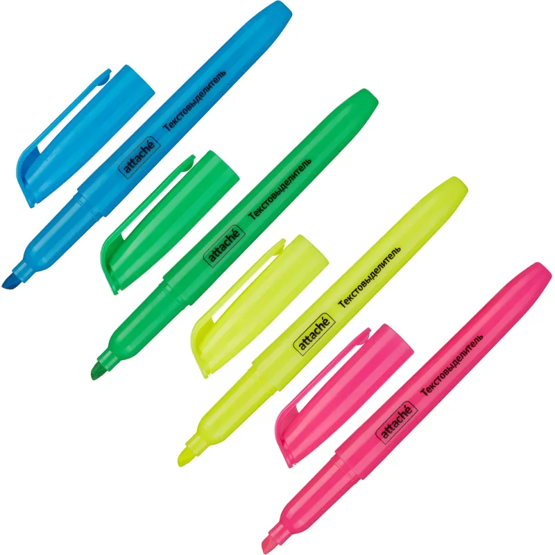 Набор текстовыделителей Attache - это отличный выбор для любителей рисования маркерами. Текстовыделитель поможет выделять самое важное в документах или просто тексте, и Вы сможете обработать и не забыть больше полезной информации. Текстовыделитель обладает экономным расходом чернил. Светоустойчивые чернила на водной основе не выцветают даже на открытом солнце и не размазываются в процессе. Чернила не промокают бумагу. В наборе 4 цвета: розовый, желтый, зеленый, голубой. Цвет корпуса соответствует цвету чернил. Чернила не имеют запах. Скошенный наконечник имеет толщину линии письма от 1 до 3,9 мм, что обеспечивает удобство при работе с текстом, напечатанным мелким шрифтом, или таблицами.